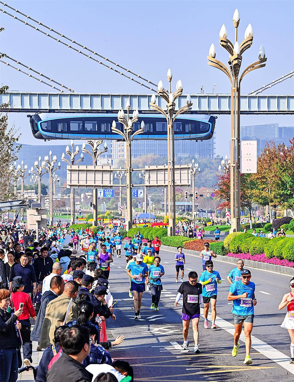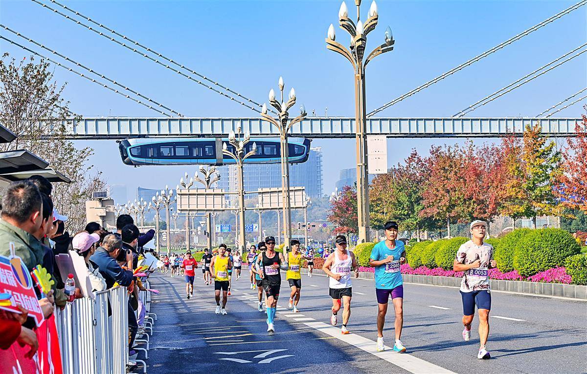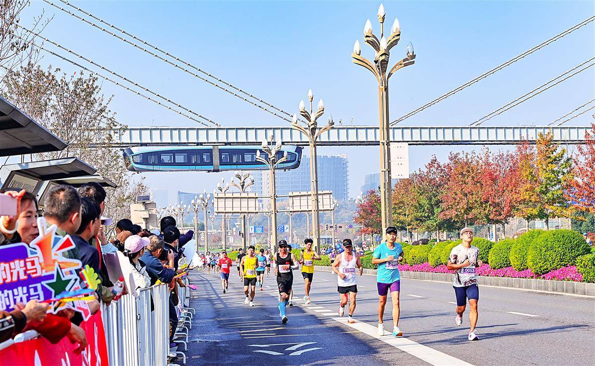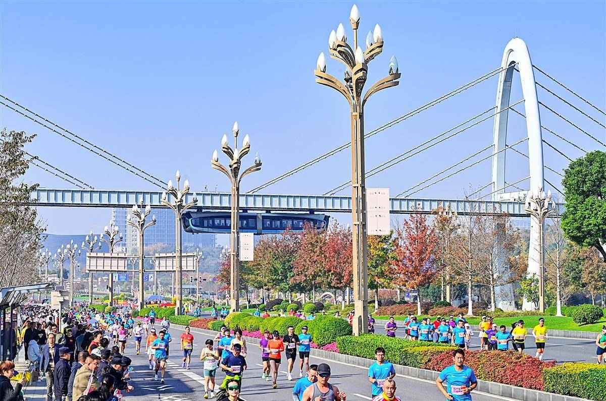 11 月16日, “光谷光子号” 空轨与奔跑的马拉松选手同框。