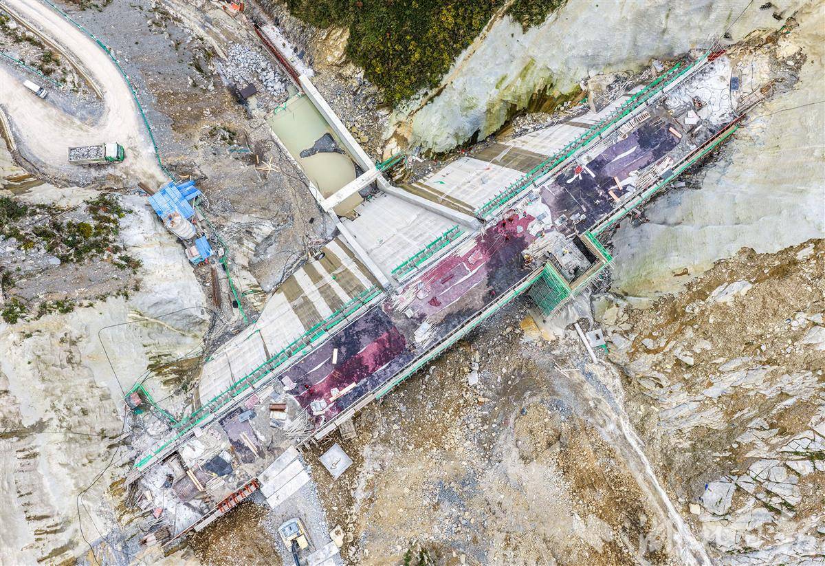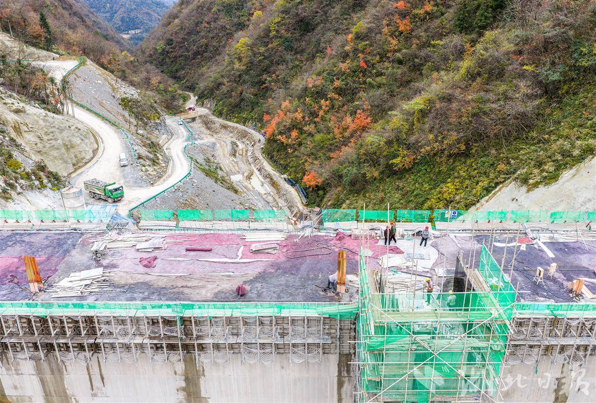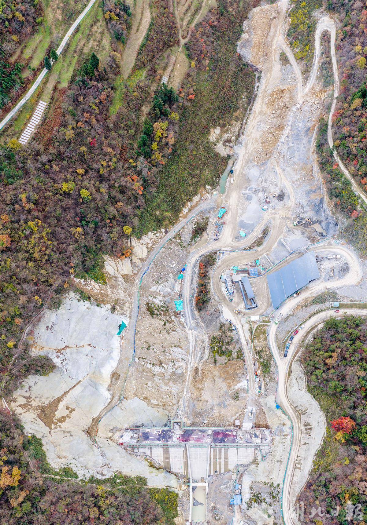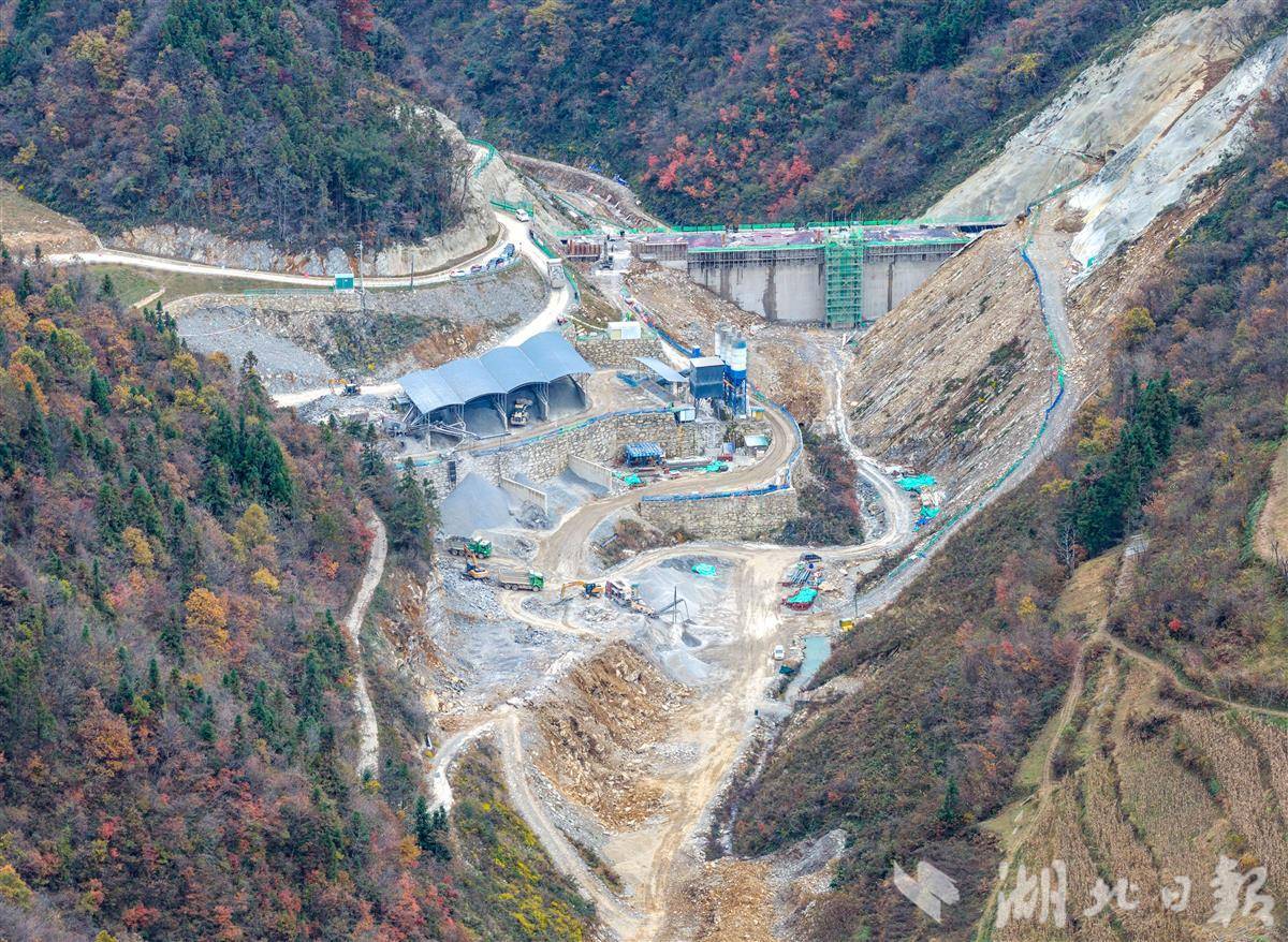 11月12日,工人在秭归县九畹溪镇罗圈荒村百步溪水库工程建设现场施工作业,现场一派繁忙景象。