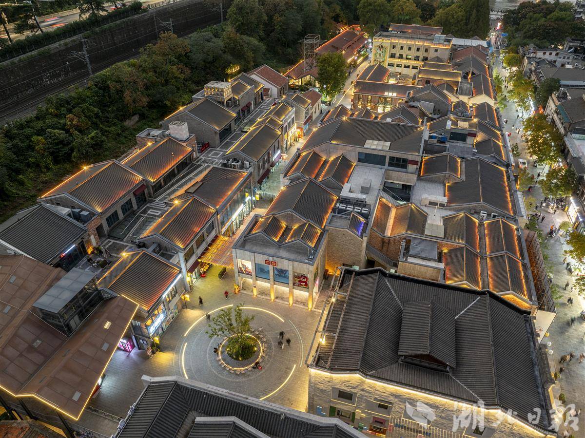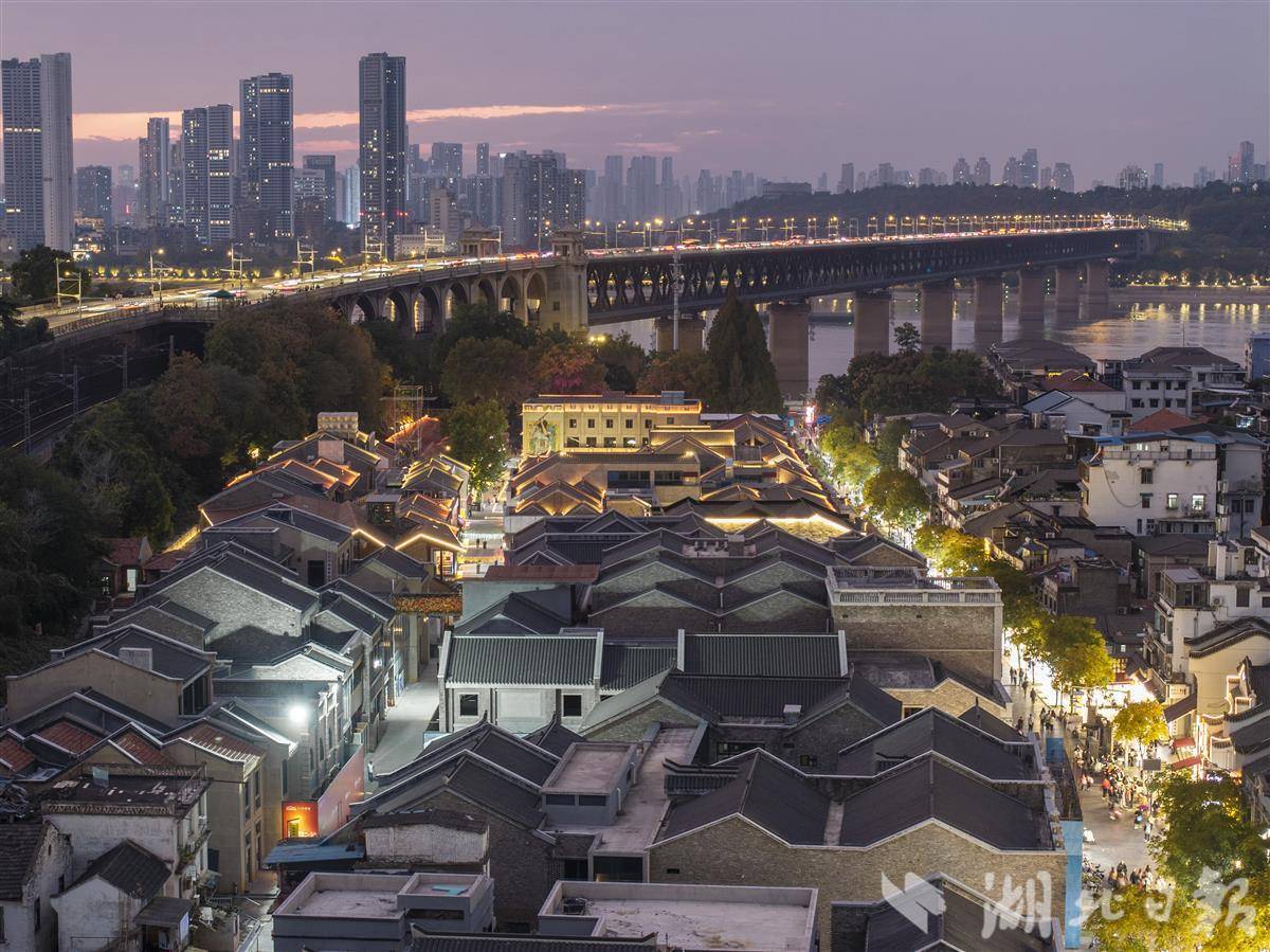 11月13日傍晚,黄鹤楼畔,焕新后的斗级营建筑群游人如织。落霞似火,修旧如旧的建筑群诉说着这条街巷的悠久历史。夜色降临,暖黄色灯光开启,空中廊桥的光影流淌于青砖墙面,披上一袭浪漫的诗意外衣。“斗级营的白天藏着历史,夜晚却在悄悄写诗。”一位游客这样感叹。