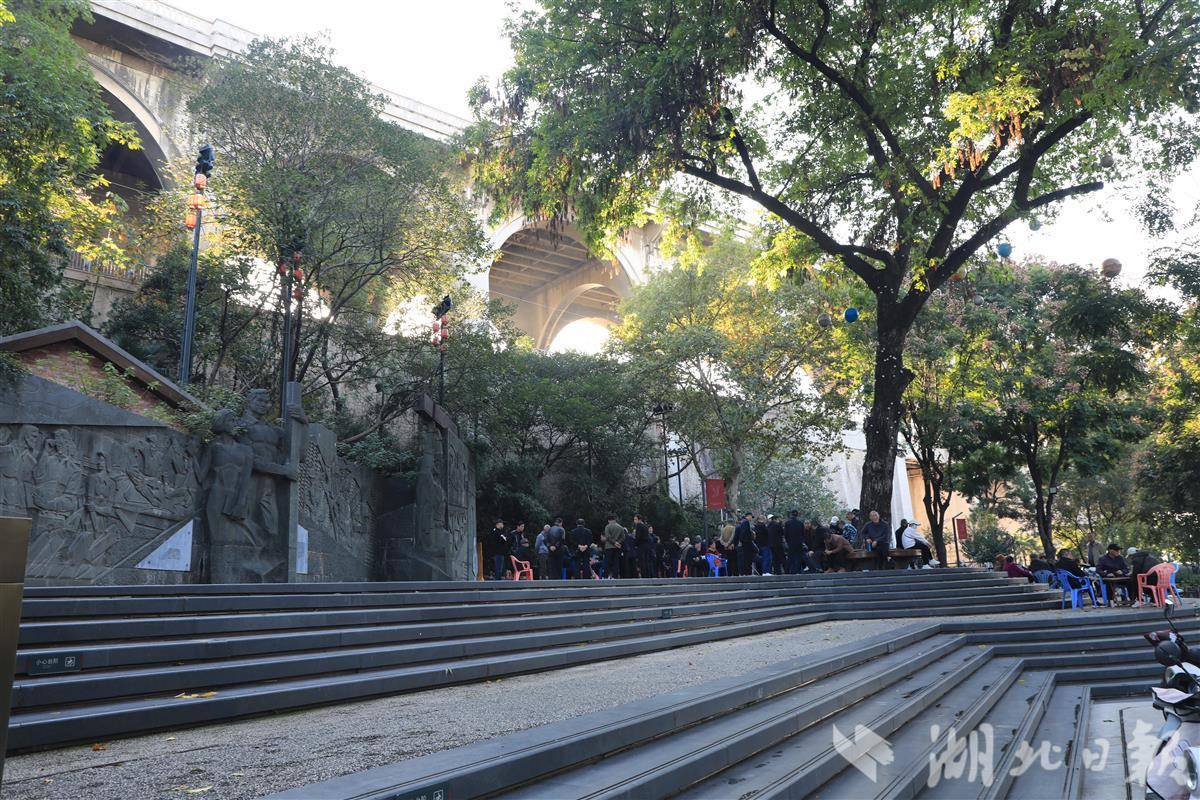 在斗级营街区西口的汉阳门花园,老人们仍习惯聚在老枫杨树下讲述民主路的往事,孩子们在旁嬉戏。站在花园观景平台远眺,长江浩荡、大桥巍峨,时光仿佛在此停留。