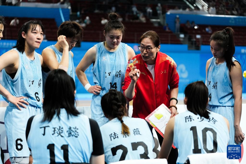 11月16日,江苏队主教练陈生萍(右三)在比赛间隙布置战术。