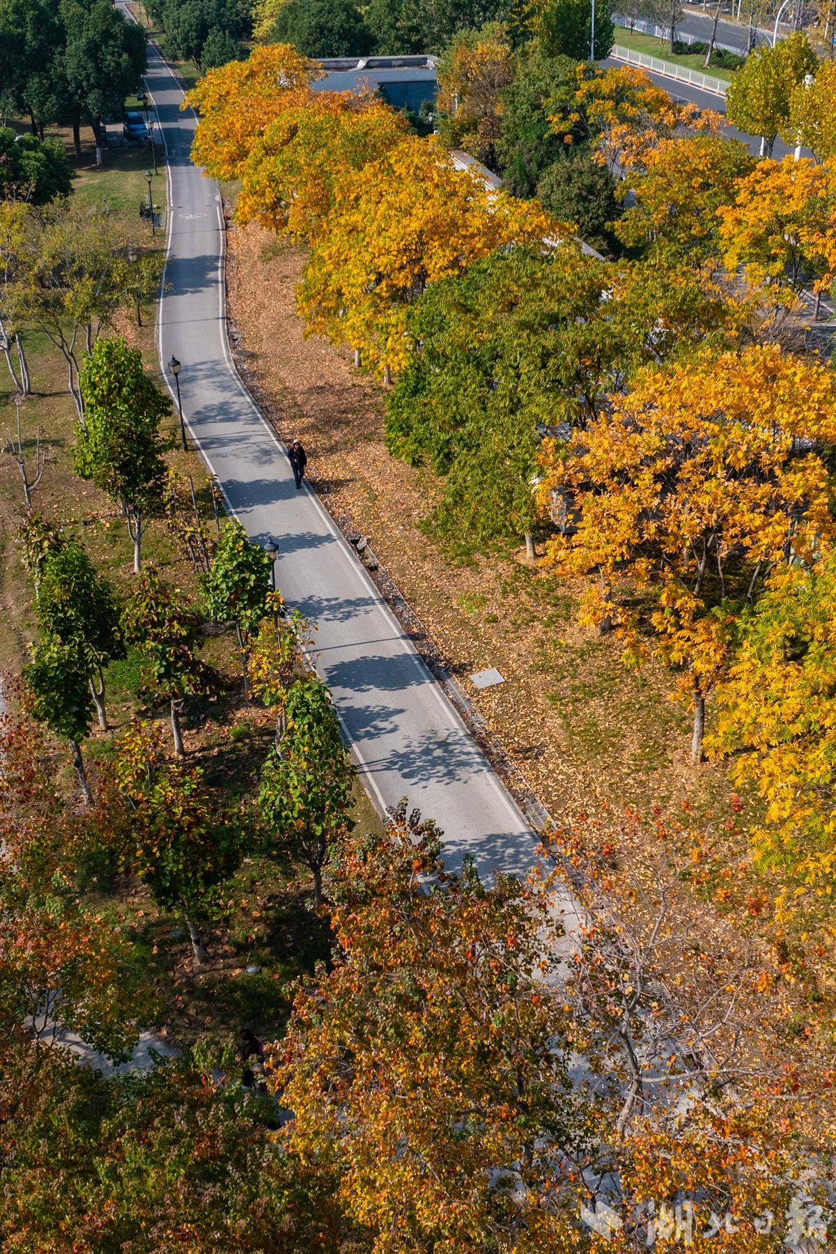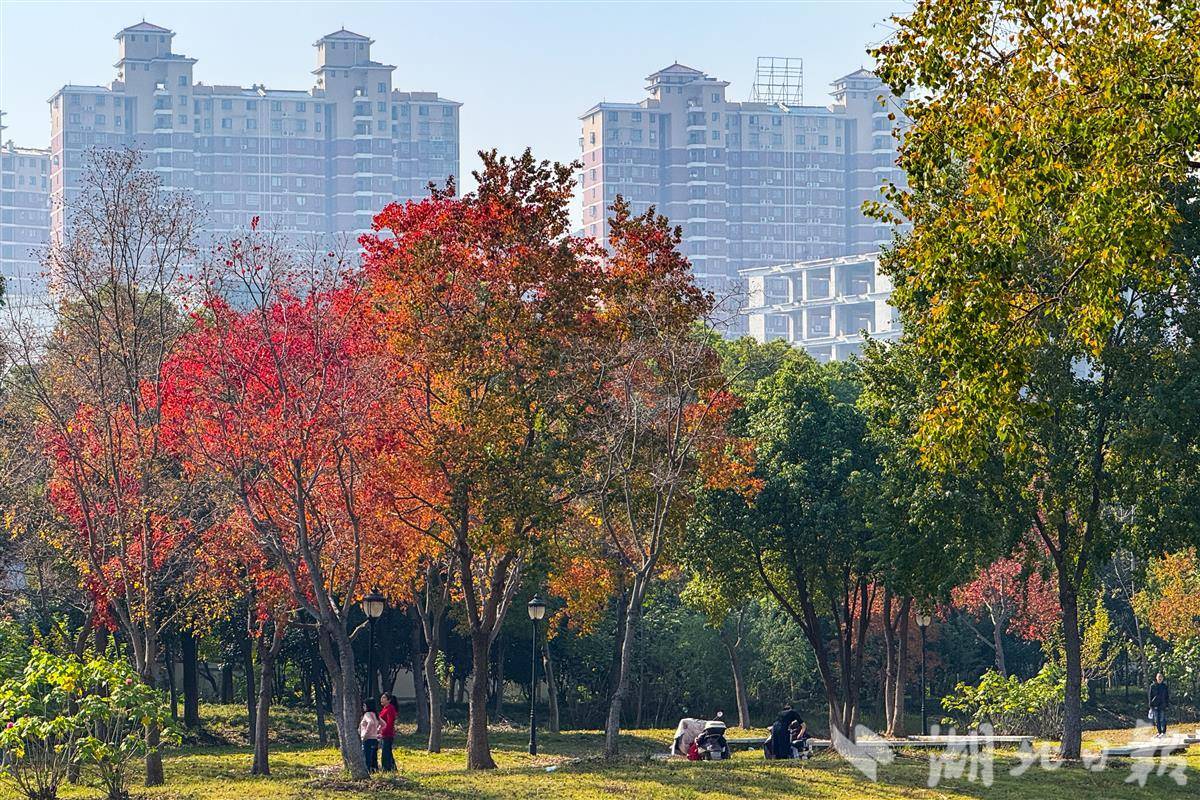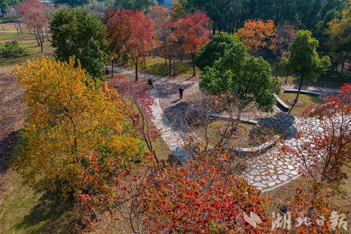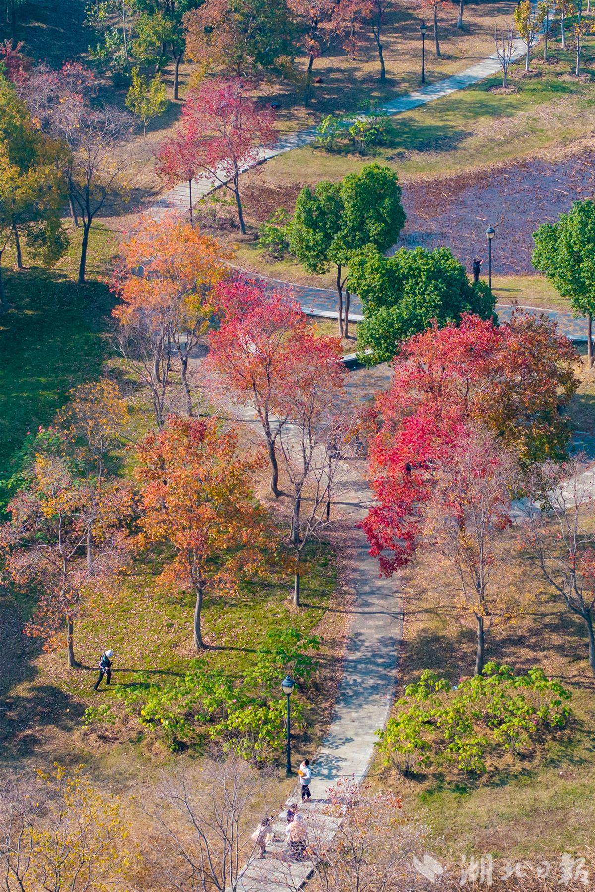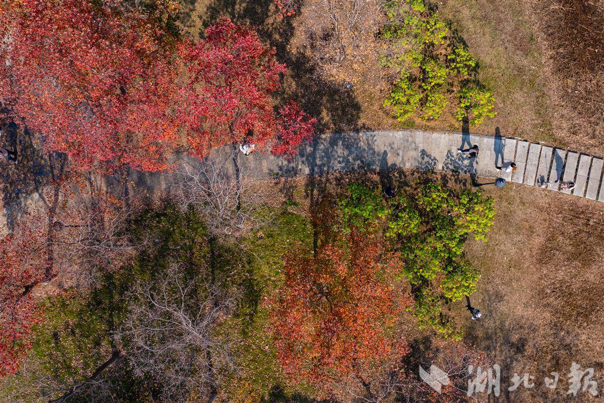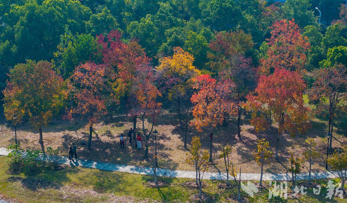 初冬的武汉五彩斑斓,金银湖公园地铁站外乌桕林火红出圈!11月的小径铺满炽烈红叶,灿烂阳光下,叶片如火焰般跳跃,与周边渐变的黄、橙交织成油画般的秋色画卷。市民驻足拍照,沉醉于这份初冬限定的浪漫,乌桕林成为城市里最“出片”的打卡地。(湖北日报全媒记者 倪娜 摄)