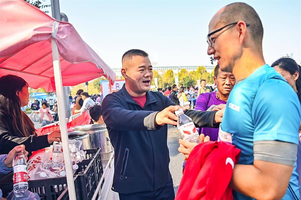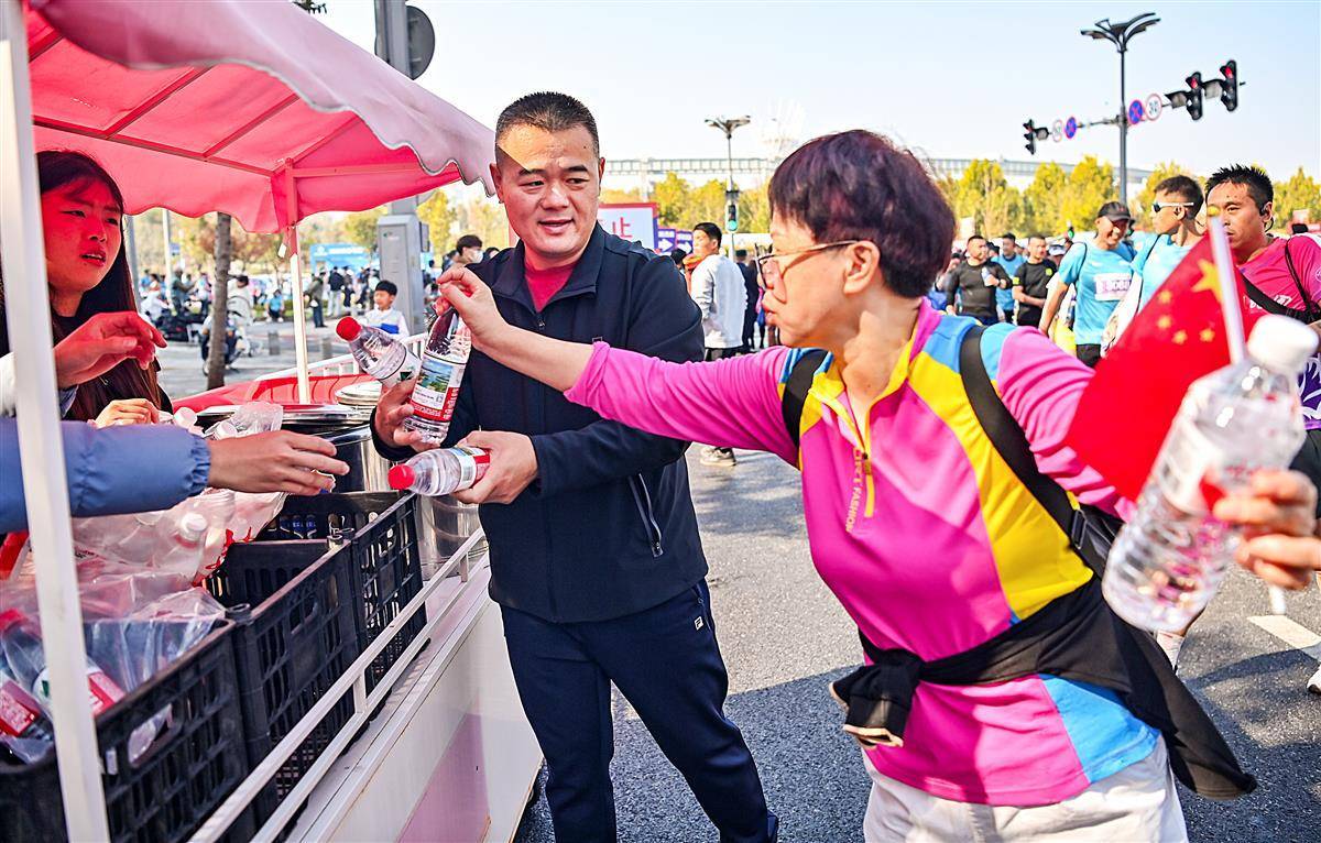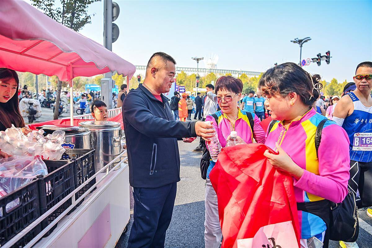 11 月16日, 2025光谷马拉松在武汉东湖高新区鸣枪开跑,爱心“送水哥”——金贵平,在半马终点选手出口处摆摊为选手们送清凉。