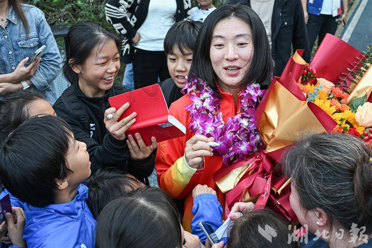 11月16日下午,在武汉塔子湖体育中心,湖北女足载誉归来。在欢迎仪式现场,女足姑娘们被小球迷们团团围住索要签名和合影。(湖北日报全媒记者 任勇 摄)