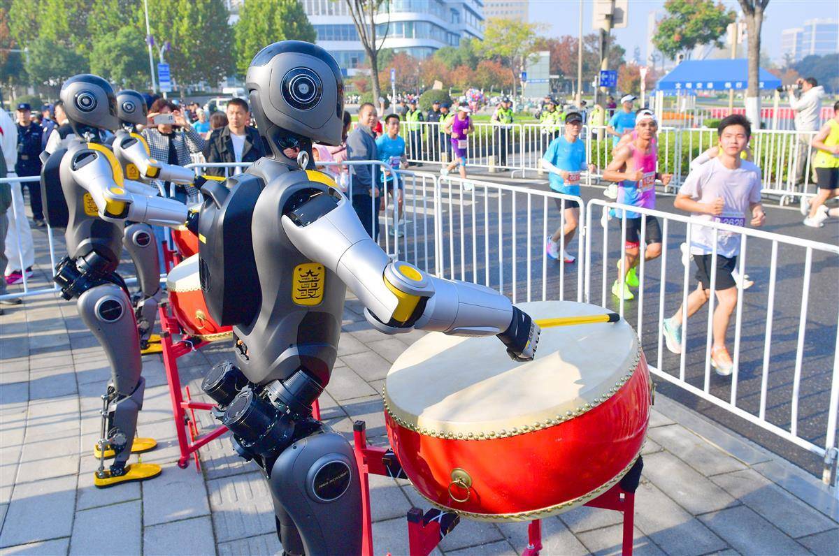 11月16日,武汉光谷马拉松赛道第16.6km处,3台人形机器人正随着音乐节奏,挥起鼓槌,用整齐有力的鼓点为选手们加油。本届光谷马拉松将人形机器人尖端科技元素融入比赛场景,打造个性化的“赛博光马”体验。(湖北日报全媒记者 柯皓 通讯员 张璨龙 摄)
