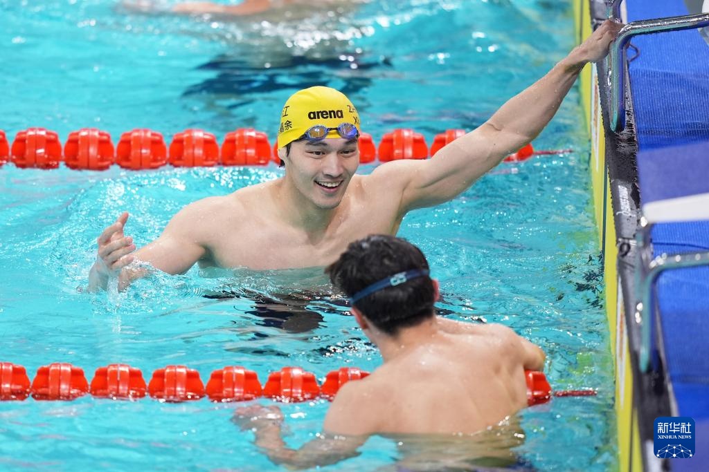 11月16日,浙江队选手徐嘉余(后)在比赛后。他以24秒36的成绩晋级决赛并刷新全国纪录。