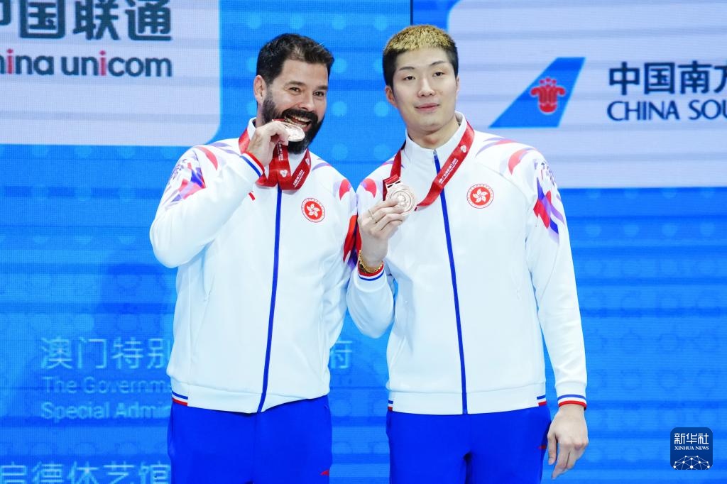 11月16日,获得季军的香港队选手张家朗(右)与教练在颁奖仪式上。