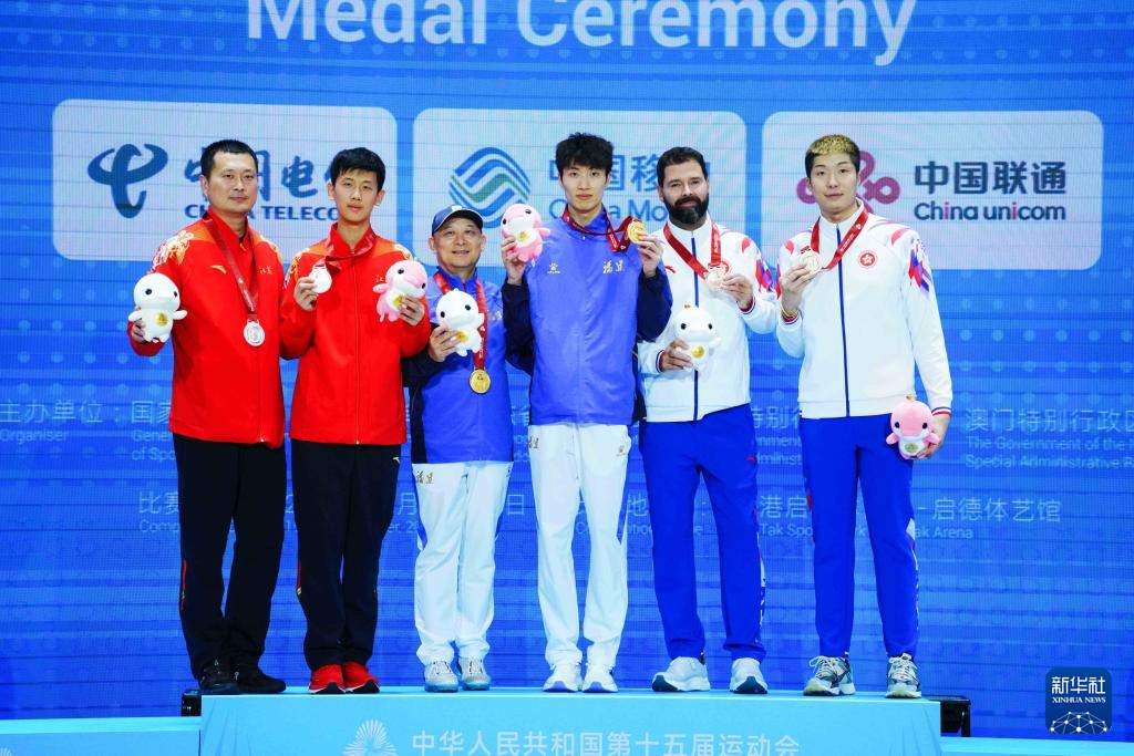 11月16日,获得冠军的福建队选手许杰(右三)、获得亚军的江苏队选手邹天一(左二)、获得季军的香港队选手张家朗(右一)在颁奖仪式上与教练合影。