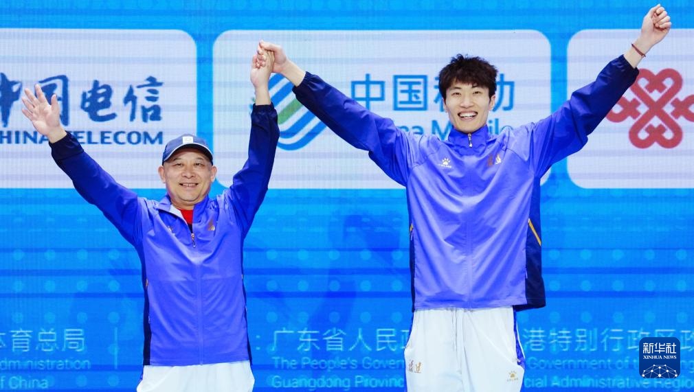 11月16日,获得冠军的福建队选手许杰(右)与教练在颁奖仪式上。