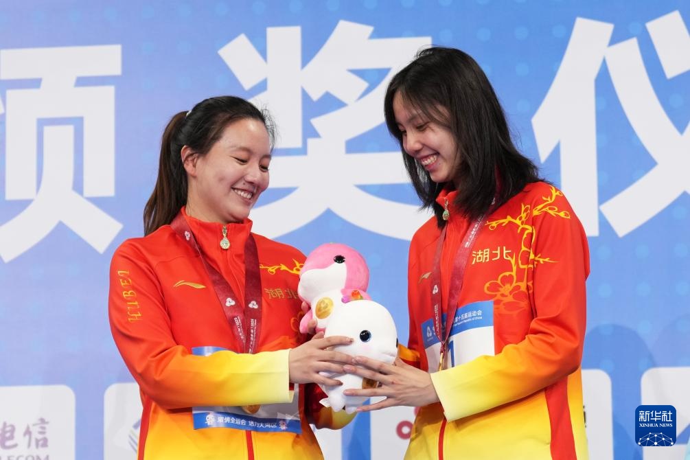 11月16日,获得冠军的湖北队选手彭旭玮(右)在颁奖仪式后。