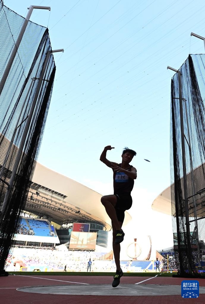 当日,第十五届全国运动会田径男子十项全能铁饼比赛在广州举行。