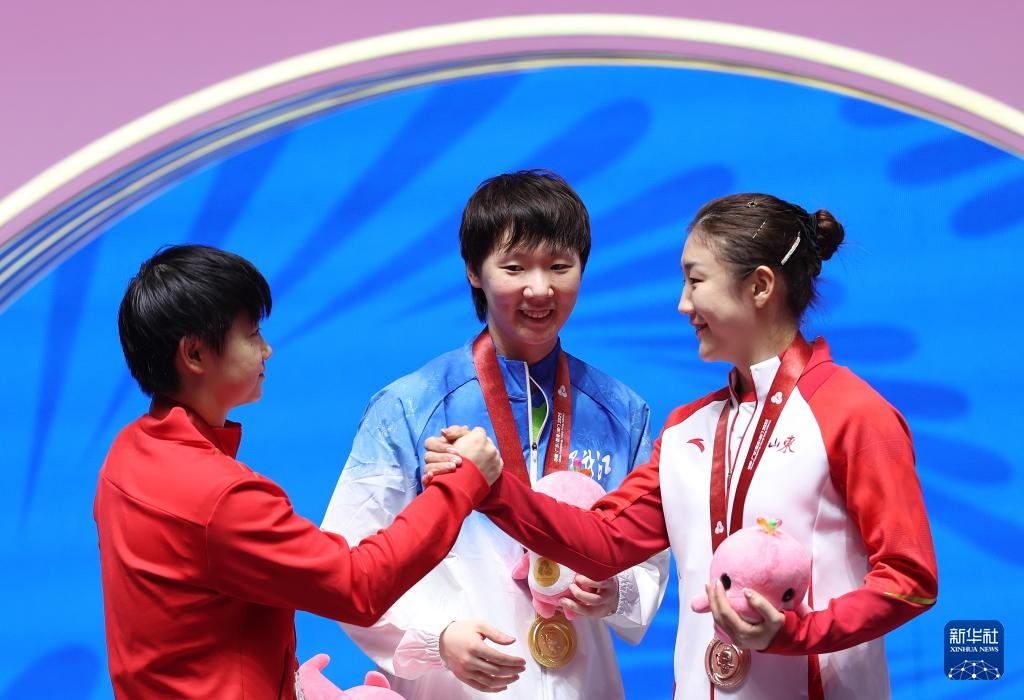 11月16日,冠军黑龙江队选手王曼昱(中)、亚军河北队选手孙颖莎(左)和季军山东队选手陈梦在颁奖仪式上。