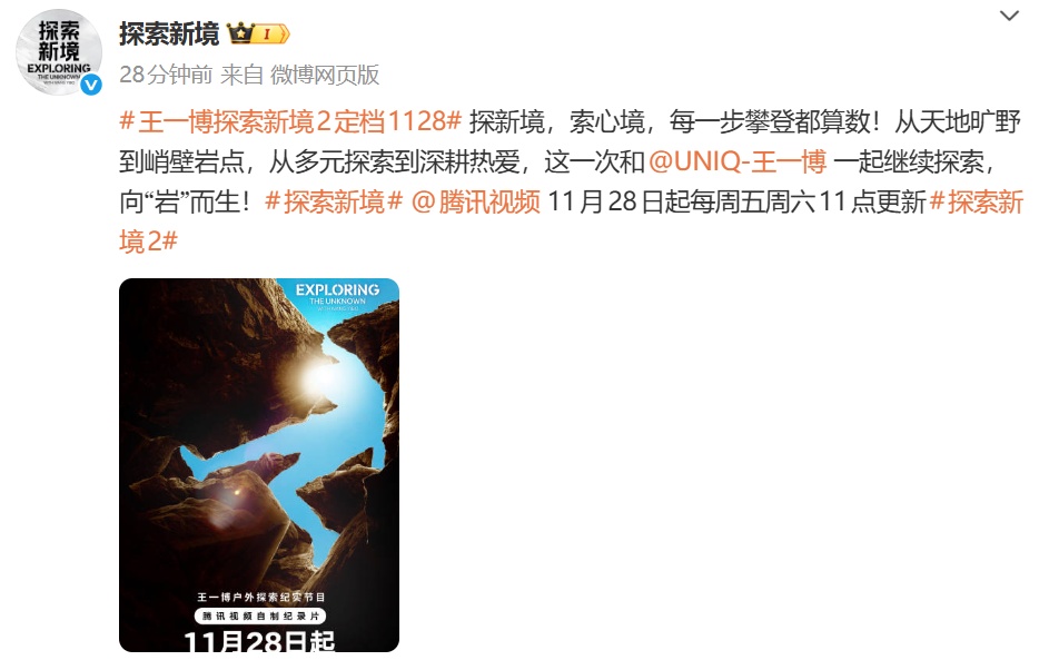 11月17日,@探索新境 发布海报,官宣《探索新境》第2季定档11月28日。