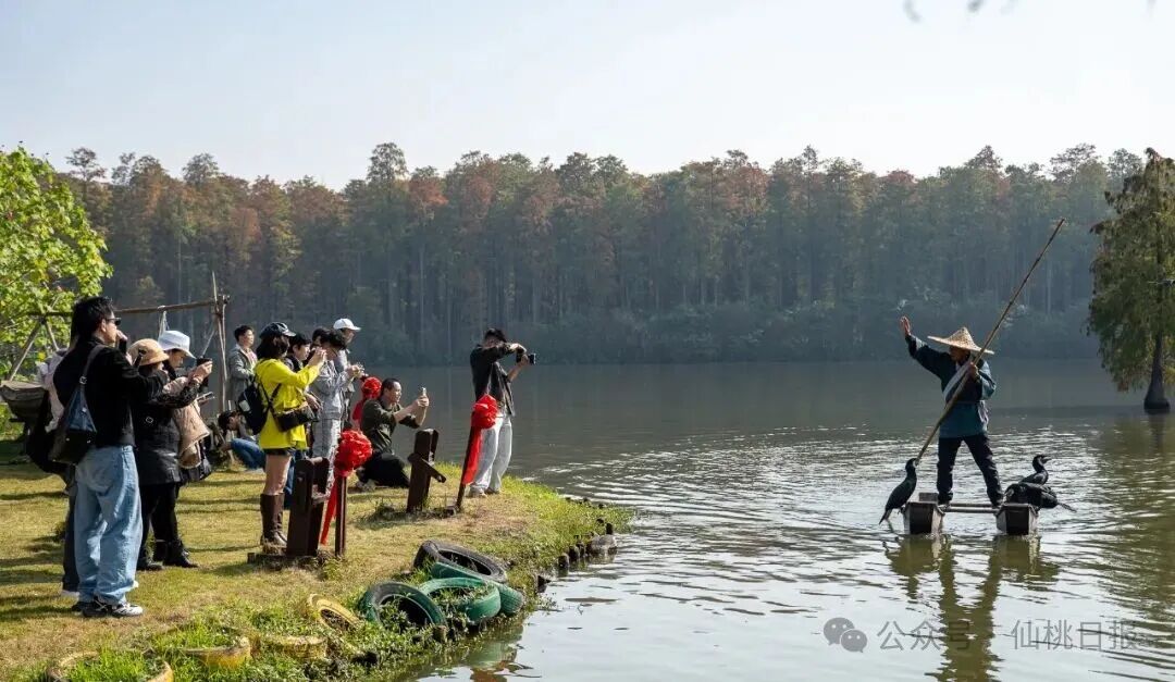 大V们漫步农耕文化一条街,观摩辣椒、花生、玉米等农作物,感受丰收的喜悦;驻足欣赏沔阳雕花剪纸的精巧技艺,观看省级非遗代表性传承人闵明辉手持大鼓的精彩演绎。乘一叶轻舟,驶入如梦似幻的水上森林,成片水杉倒映水面,枫叶点缀其间,宛如一幅流动的秋日画卷。“走过全国不少地方,从没见过这么大面积的水上池杉林,坐船穿梭其中,随手一拍都是大片,像掉进了童话里!网络大V“圈圈”满眼兴奋。水上婚礼的巧妙融入,更为这片意境增添了浓厚文化气息。现场再现老沔阳渔民“以船为家、日出而作” 生活场景的演绎,将水乡民俗的独特韵味展现得淋漓尽致。