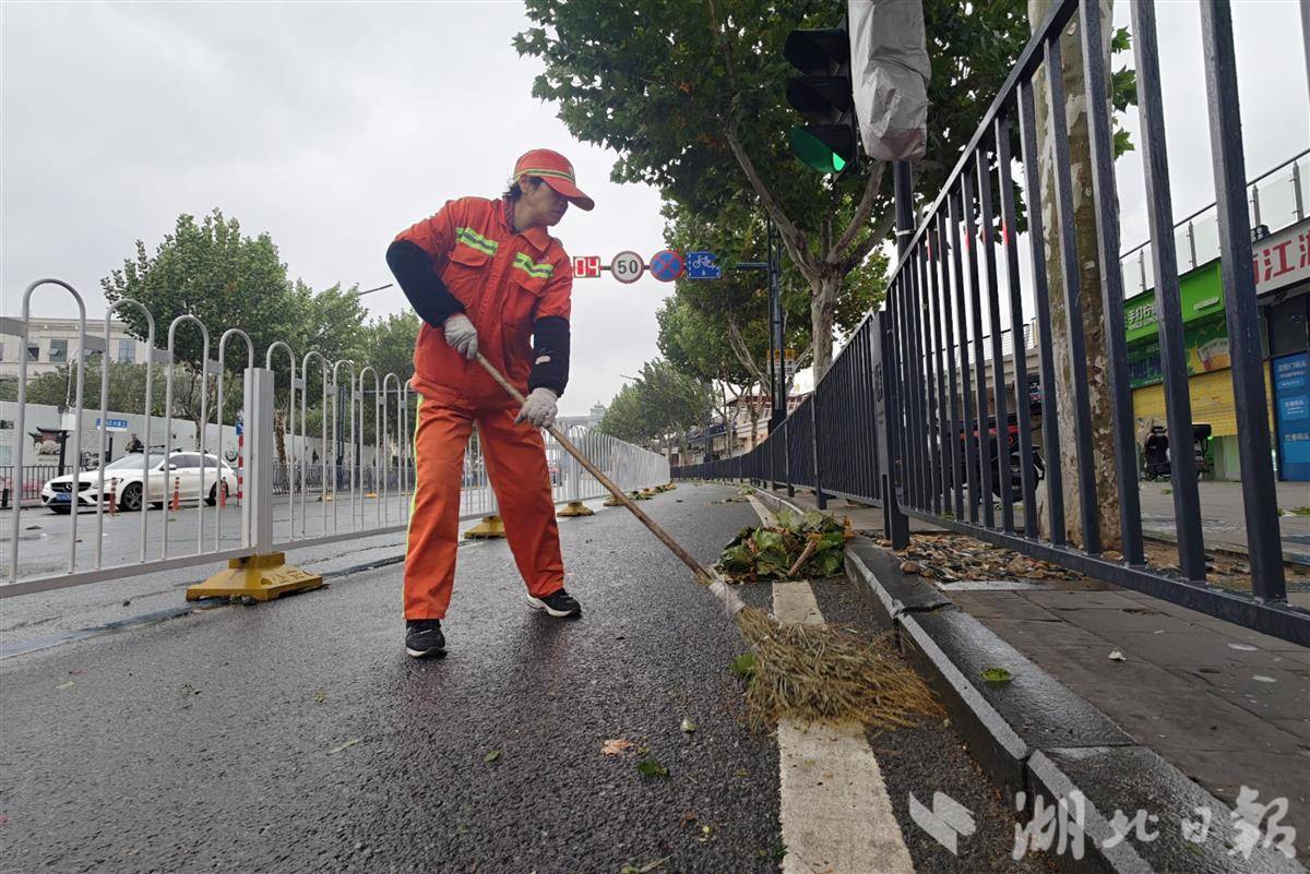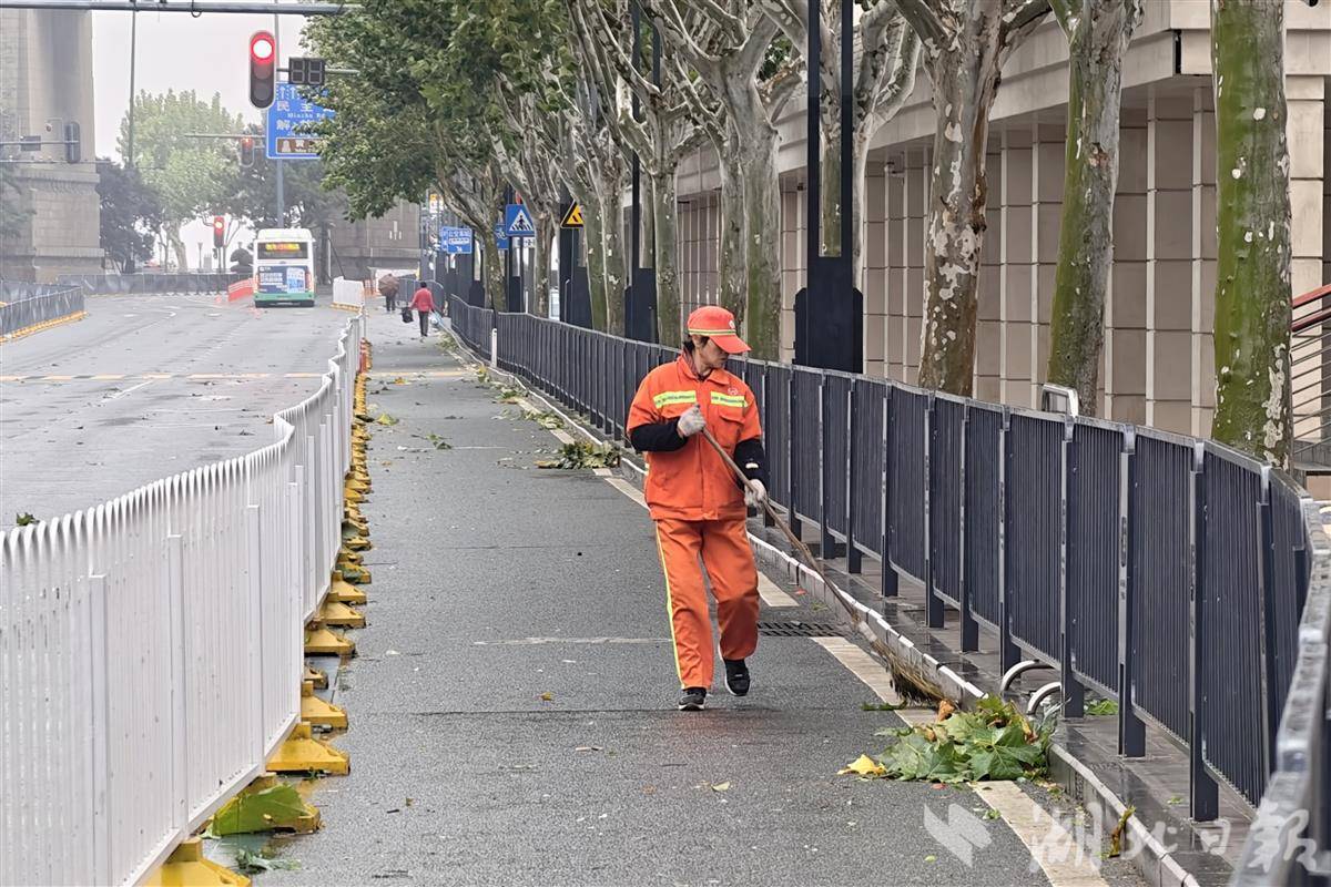 武汉环卫逆风出动,清扫路面落叶和杂物。