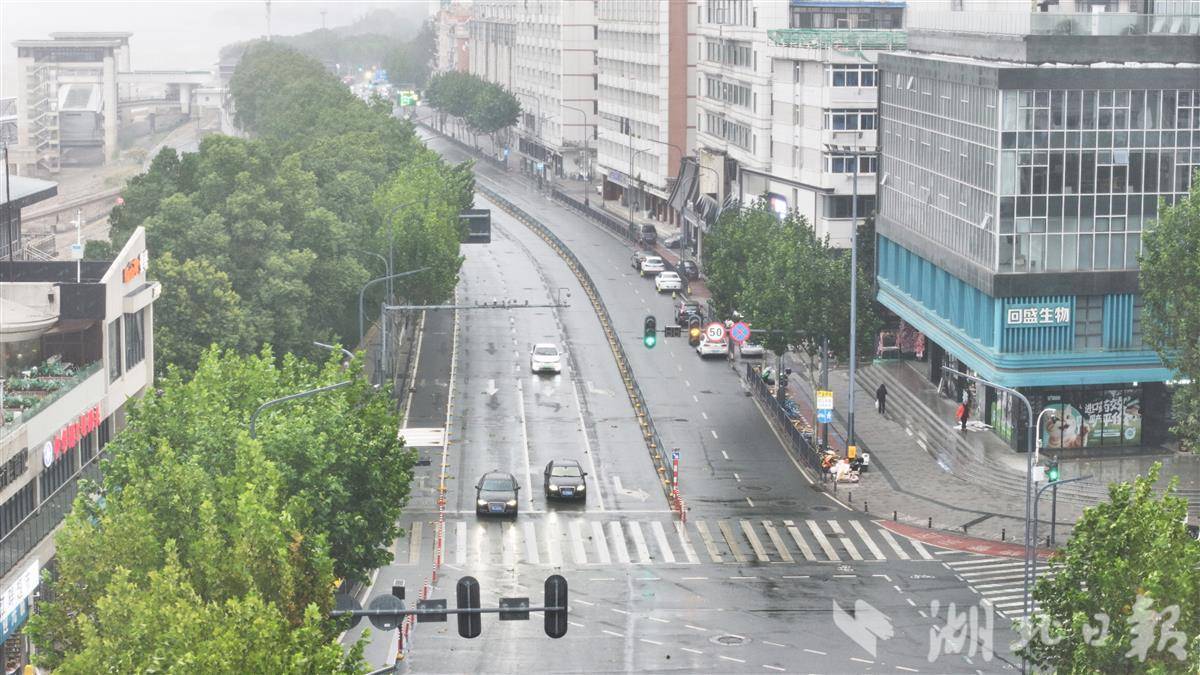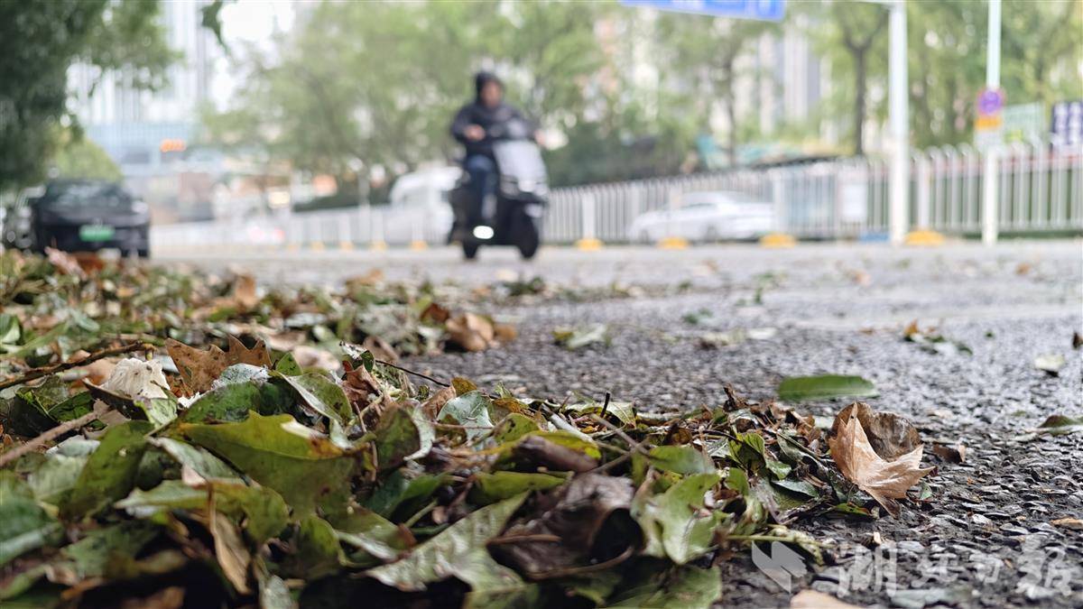 11月17日,武汉市遭遇寒潮侵袭,气温骤降至且伴随大风、阴雨天气。 市民普遍避免外出,街头行人稀少。然而,武汉环卫逆风出动,清扫路面落叶和杂物,保障道路清洁。(湖北日报全媒记者 陈少哲 摄)