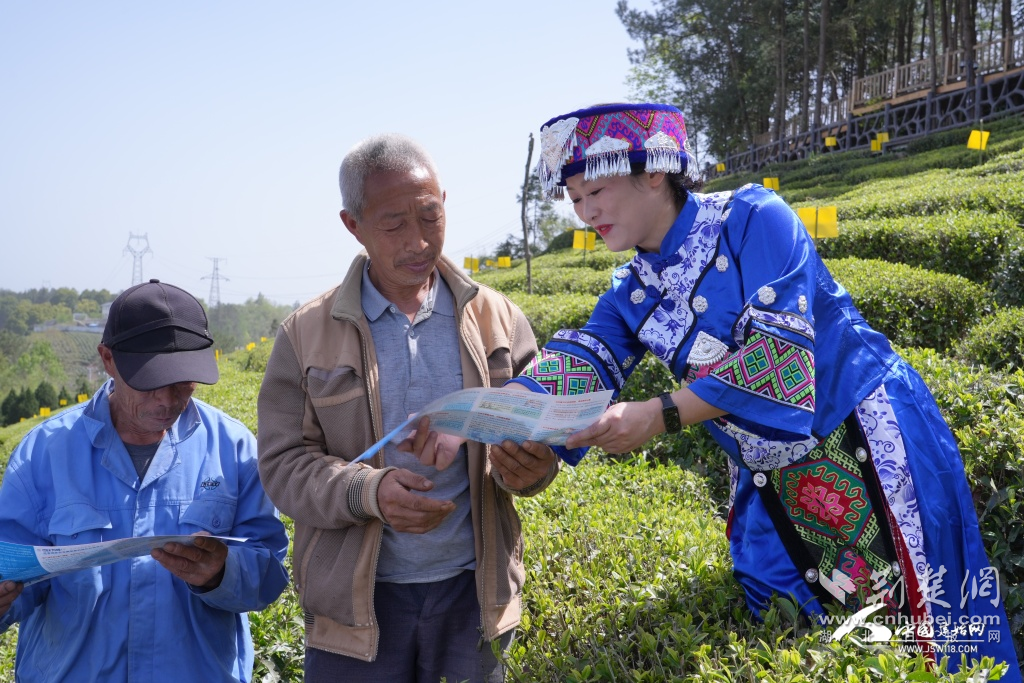 建始县创新开展茶园普法活动,工作人员正给群众发放普法宣传册