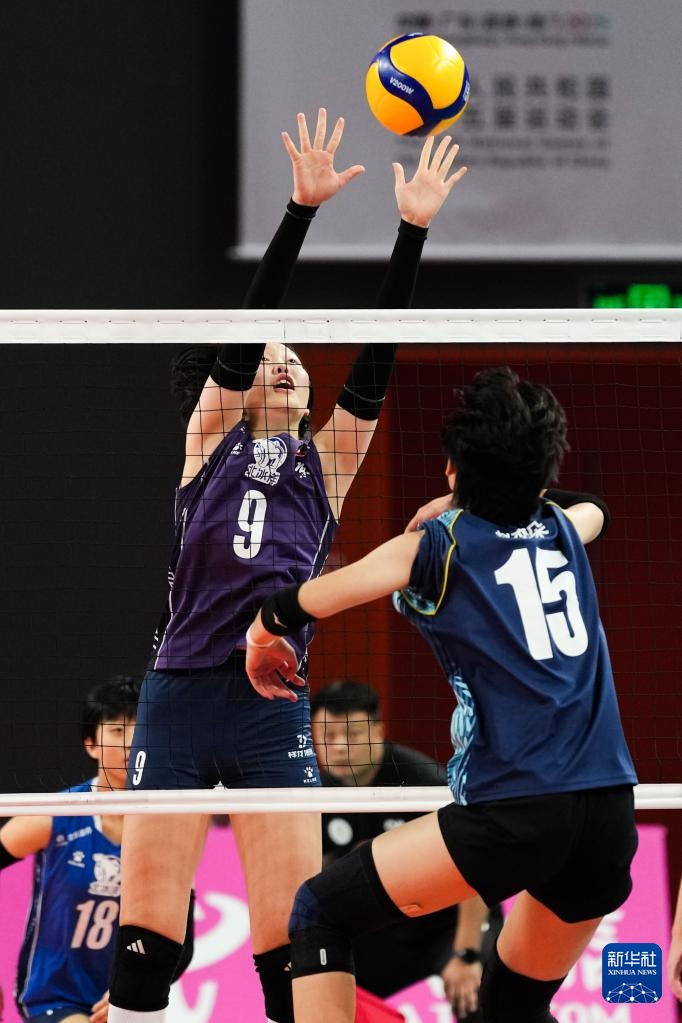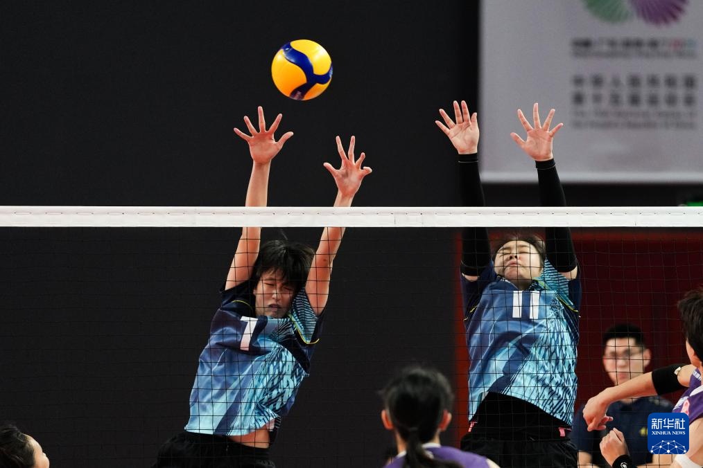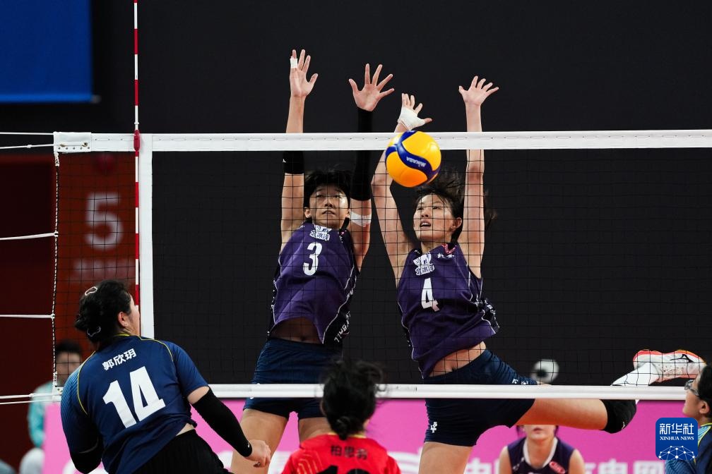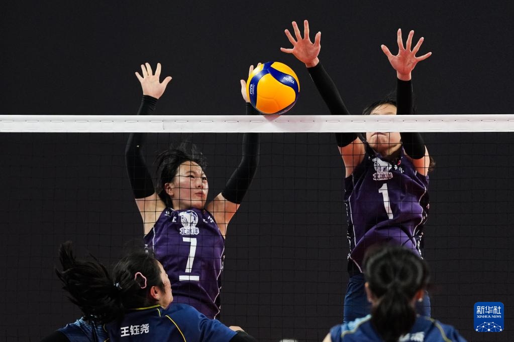 11月17日,北京队球员王程儒(左)、孙雯煜(右)在比赛中拦网。