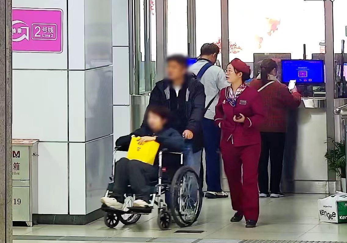 杨尚奇迅速取来轮椅扶乘客坐下,并利用手持台向值班站长张佩玉报告情况。