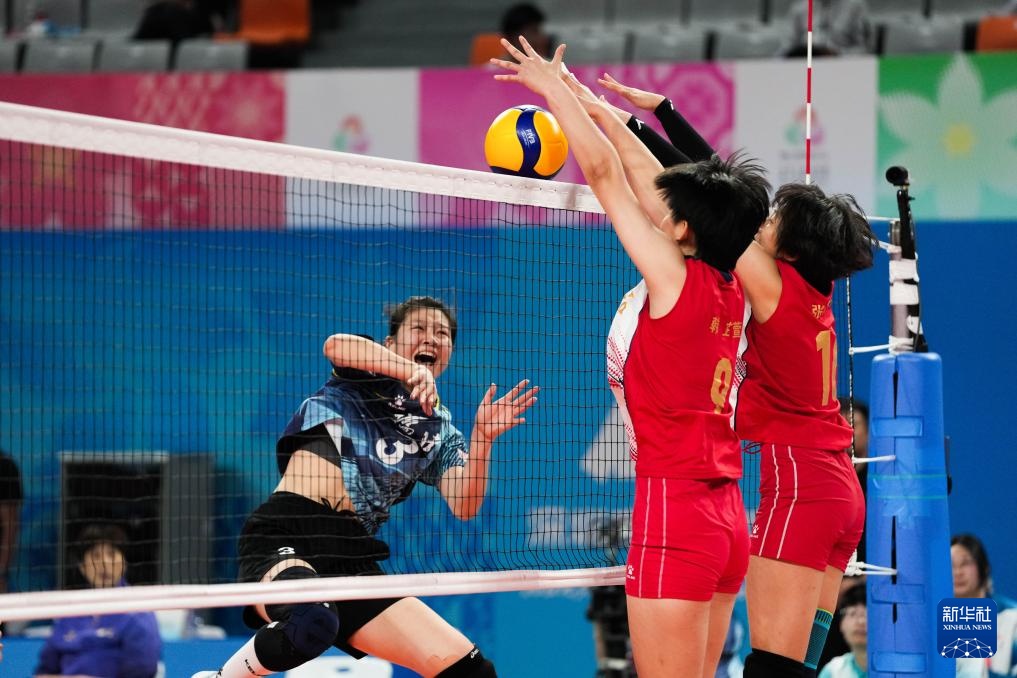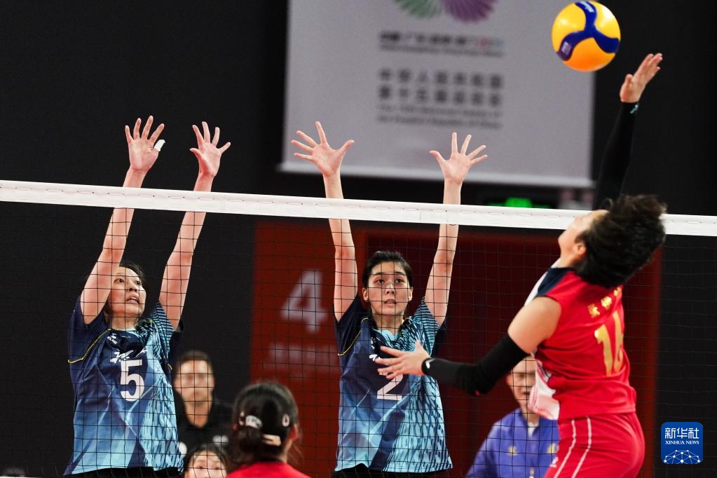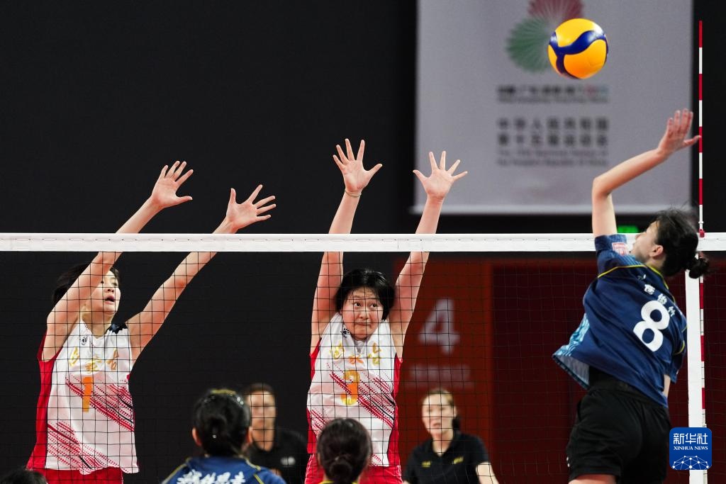 11月17日,内蒙古队球员陈紫阳(左)、郭姝廷(中)在比赛中拦网。