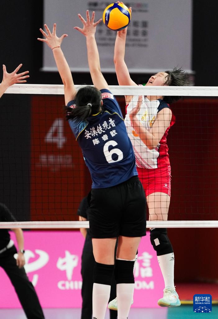 11月17日,内蒙古队球员郭姝廷(右)在比赛中扣球。