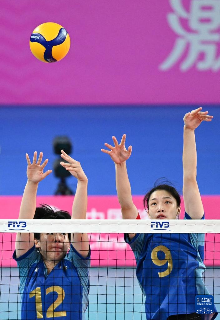 11月17日,天津队球员李雪(右)、李荣钰(左)在比赛中拦网。