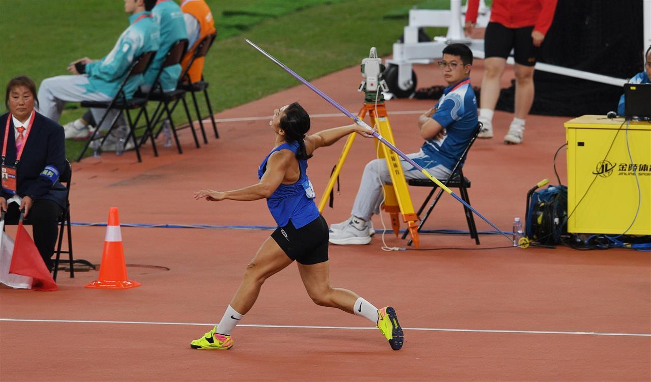 决赛共有12名选手参赛,来自全国各地的顶尖选手展开激烈角逐,其中湖北队苏玲丹、吕会会与浙江队戴倩倩形成三足鼎立之势。苏玲丹第一轮就投出62米42,锁定全场最好成绩。随后,她全程保持稳定发挥,凭借爆发力强、助跑节奏稳定的技术特点,多次投出60米以上的优异成绩。