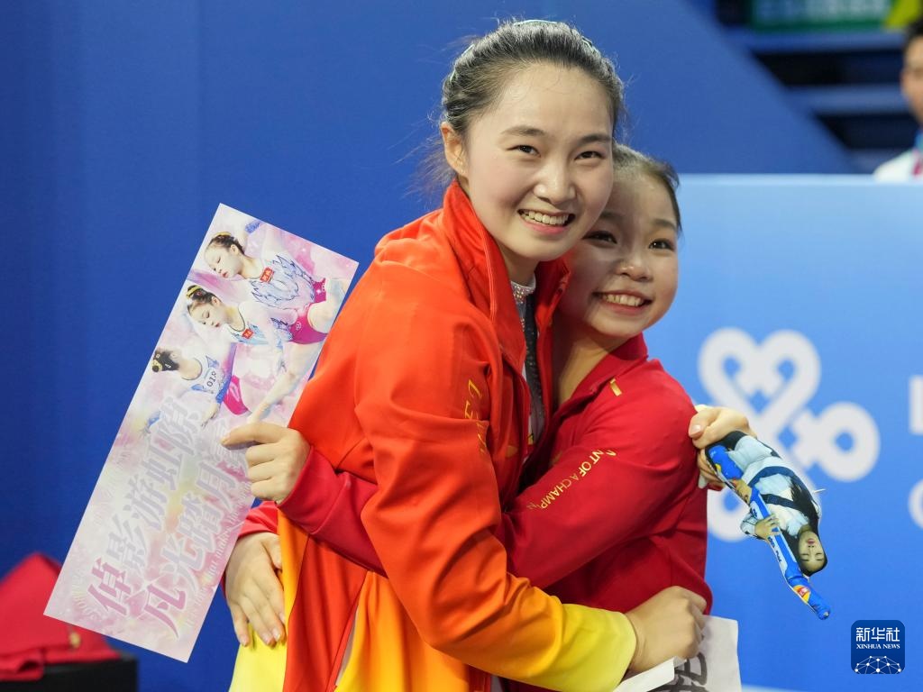 11月17日,湖北队选手赵佳怡(左)与河北队选手田倬凡在比赛后拥抱。赵佳怡夺得冠军。