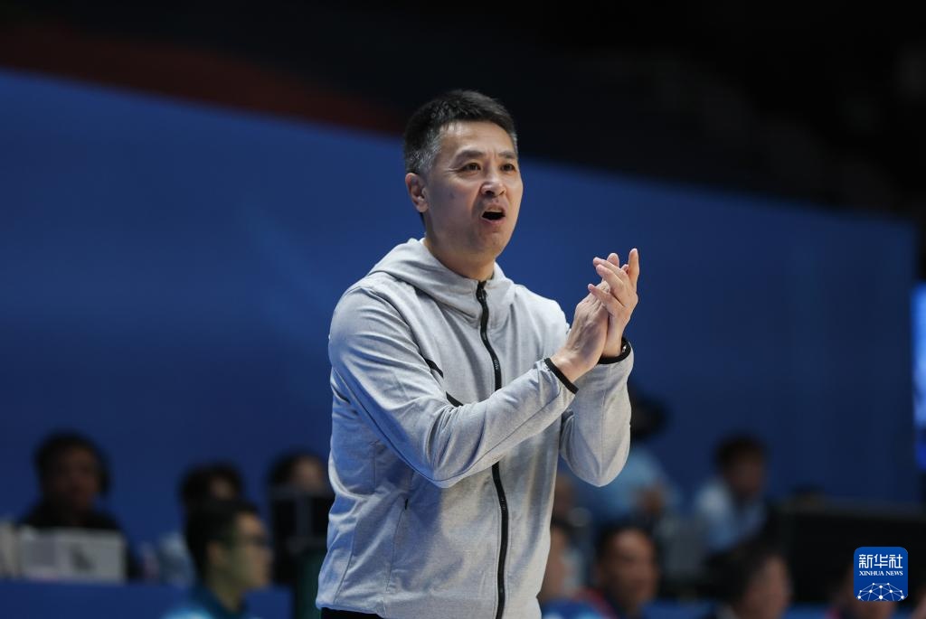 11月17日,上海队主教练王勇(右)与裁判沟通。