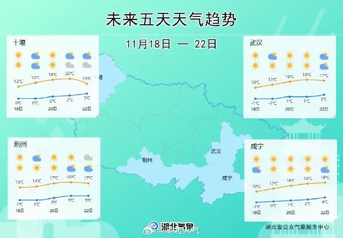 未来三天全省大部地区天气晴朗,仅恩施局地今天有小雨出没。气温逐步回升,最高气温今天9~13℃,明天12~16℃,后天将升至16~20℃。