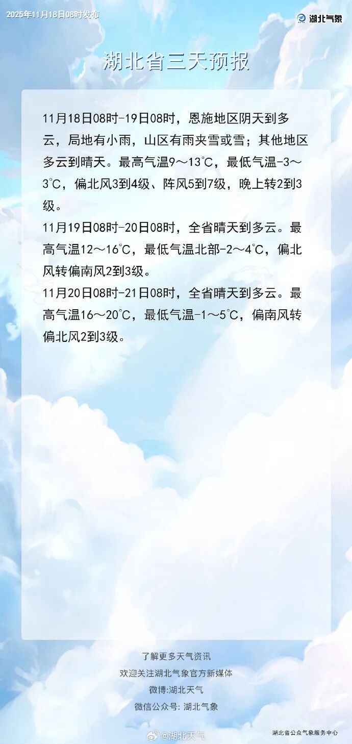 部分地区出现7到10级偏北阵风。最高气温鄂西北仅2~6℃、其他地区7~16℃,最低气温-2~5℃。