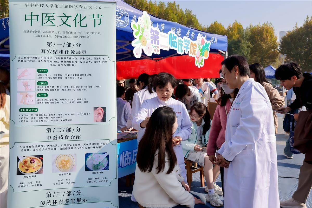 2025年11月16日上午,华中科技大学同济医学院第三届医学专业文化节在学院中心篮球场举行,吸引大批师生及社区居民前来参加。活动由医学学生工作处主办、同济医学院等9个院系联合承办,涵盖医疗技能实践、医学知识学习、专家现场问诊、健康知识科普教育、医药产品制作等多形式医学体验内容,既面向社区居民开展义诊宣教,更能帮助医科新生深化专业了解和职业认同。据了解,医学专业文化节是华中科技大学落实立德树人根本任务、创新新生教育模式的重要载体,不仅是新生入学教育的重要组成,更是一堂生动的“专业思想启蒙课”,为同学们绘制了清晰的医学学习导航图,助力他们系好医路生涯的“第一粒扣子”,为成长为新时代卓越医学人才奠定坚实基础。(湖北日报全媒记者 何宇欣 通讯员 闫颢芯 实习生 何抒澄 摄)