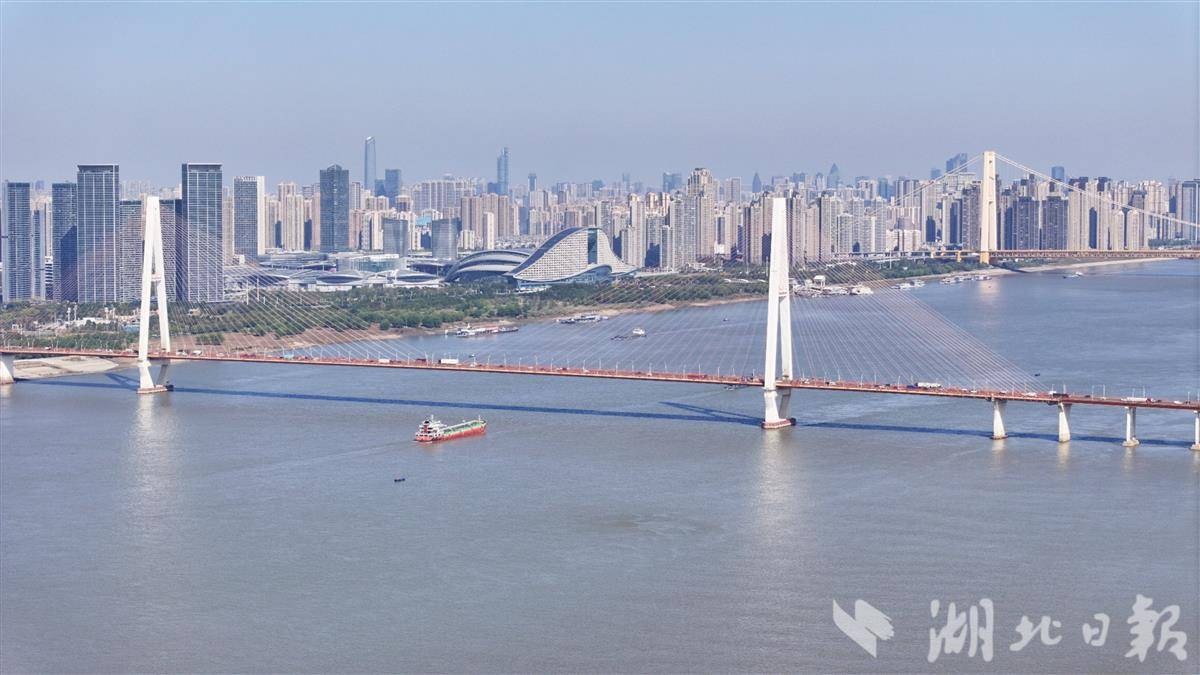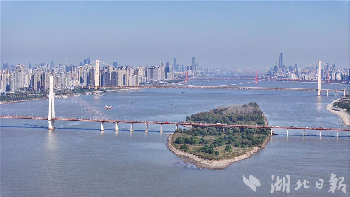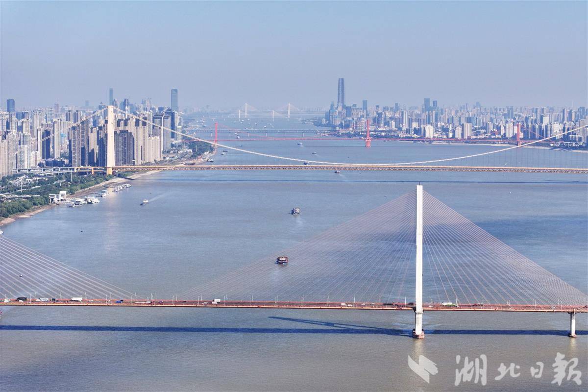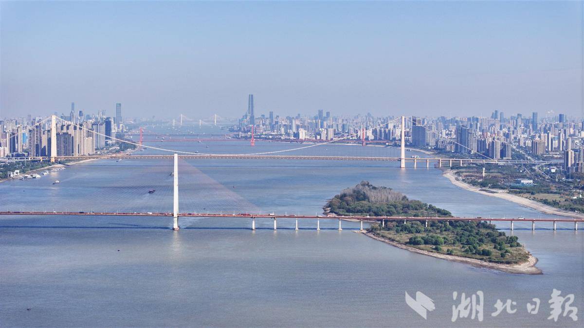 11月18日,武汉天空澄澈如洗。寒潮带来的强劲北风荡尽尘霾,长江武汉段能见度陡增,从高空俯瞰,白沙洲大桥、杨泗港大桥、鹦鹉洲大桥、长江大桥等六座跨江桥梁次第展开,形成“一眼望六桥”的壮丽画卷。江面货轮穿梭如织,受昨日大风天气短暂影响的航运全面恢复,“黄金水道”重现百舸争流景象。 (湖北日报全媒记者 陈少哲 摄)