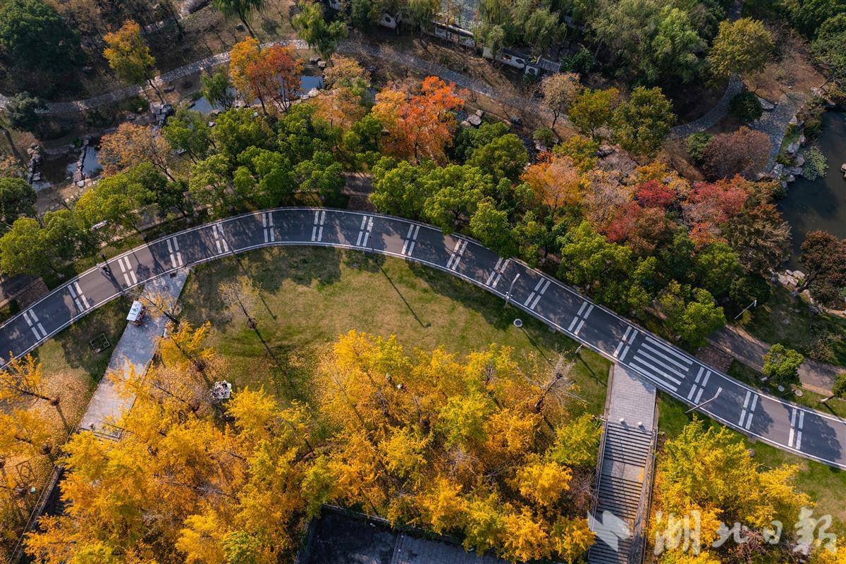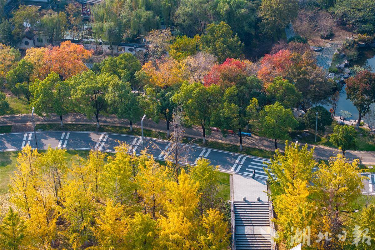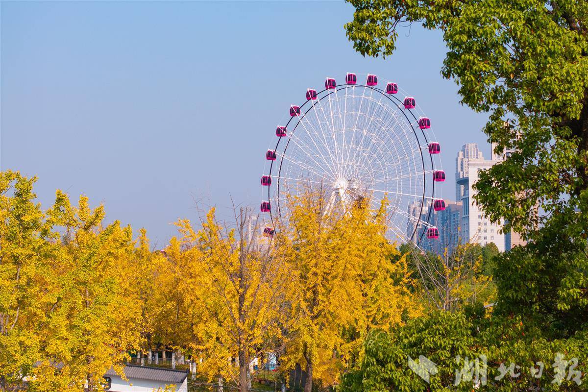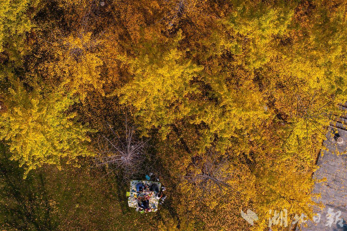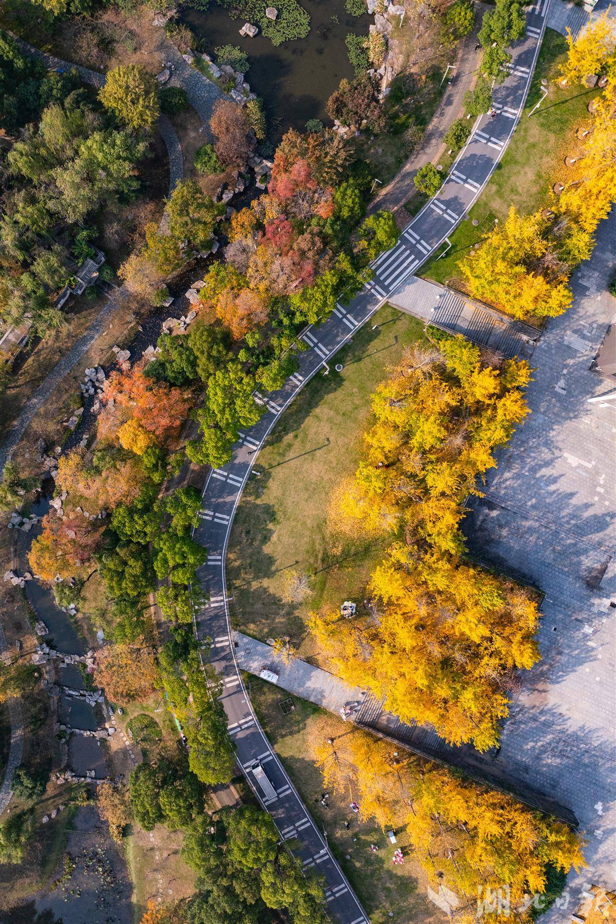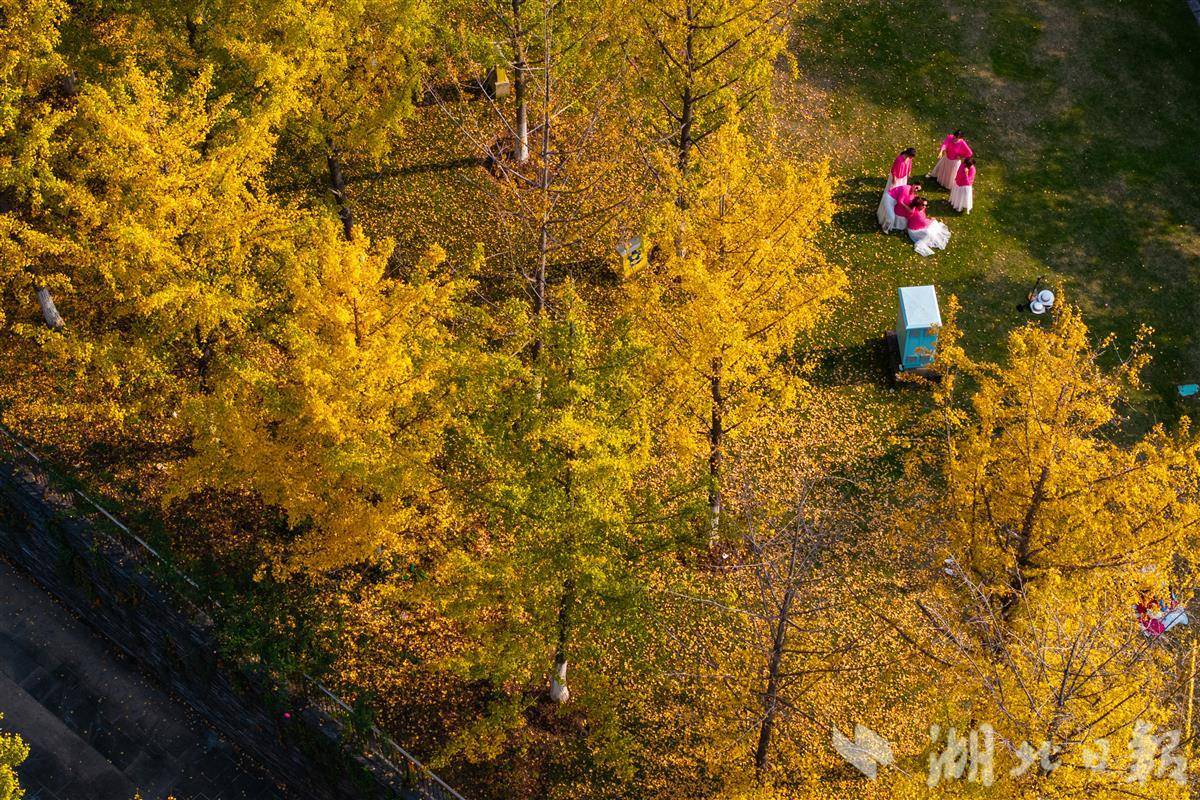 2025年11月14日,武汉初冬晴空下,园博园长江文明馆门前银杏披金,航拍镜头里金黄树冠如伞盖连绵起伏,落叶铺就的金色地毯延伸向远方。游客仰拍璀璨树梢,漫步叶毯间打卡,定格这座城市初冬风景线。(湖北日报全媒记者 倪娜 通讯员 徐志刚 晏君 摄)