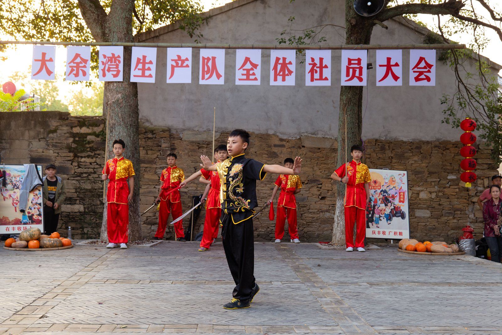 调研当日,乡村场院与街巷间,锣鼓喧天,喝彩不断。大余湾对民俗非遗的保护,绝非束之高阁,而是将其融入日常,实现了有效的“活化”传承。皮影戏幕布后的光影变幻,木偶戏艺人的巧手操控,引得孩子们阵阵惊呼;惊险刺激的非遗斗鸡表演和刚柔并济的木兰武术展示,展现了力量与技巧之美;韵味十足的楚剧、妙趣横生的湖北大鼓、神奇的川剧变脸,以及富有节日喜庆氛围的采莲船等民俗表演,轮番上场,为参观者奉上了一场场传统文化的盛筵。