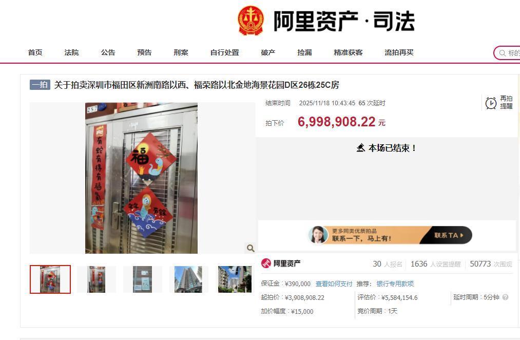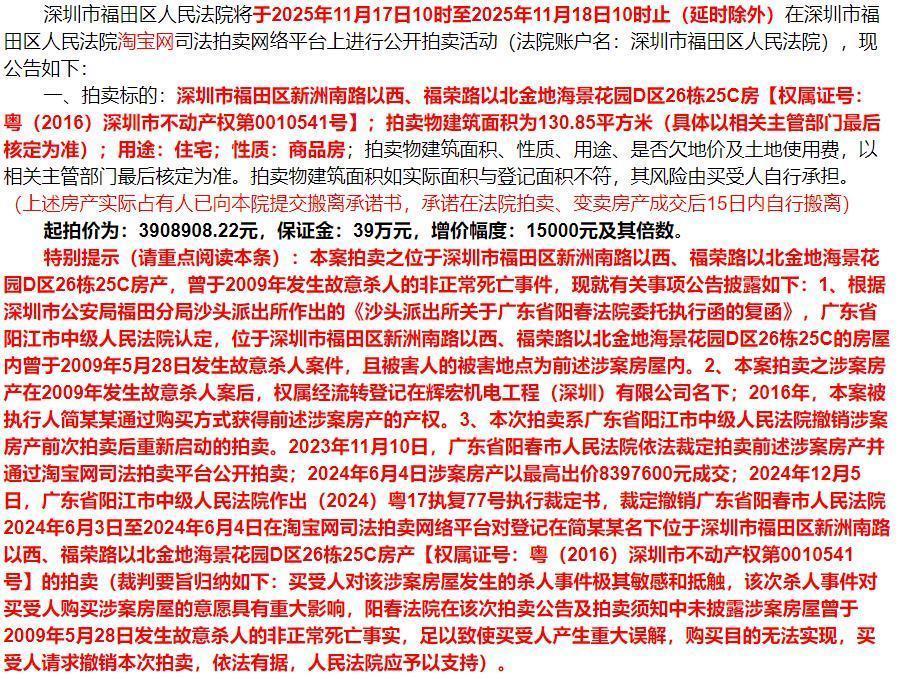 因该房产内发生故意杀人案,10月下旬,在法拍平台一挂出,就引起网友关注。法院公告提示,本案拍卖的位于深圳市福田区新洲南路以西、福荣路以北金地海景花园D区26栋25C房产,曾于2009年发生故意杀人的非正常死亡事件。此后,涉案房产权属经流转登记在辉宏机电工程(深圳)有限公司名下,2016年,简某某通过购买方式获得涉案房产的产权。此后,浙商银行股份有限公司深圳分行因与简某某等人有借款合同,法院依法强制对简某某上述房产进行拍卖、变卖。2023年11月10日,广东省阳春市人民法院依法裁定公开拍卖涉案房产;2024年6月4日该处房产以最高出价8397600元成交。同年12月5日,该拍卖交易被广东省阳江市中级人民法院裁定撤销。