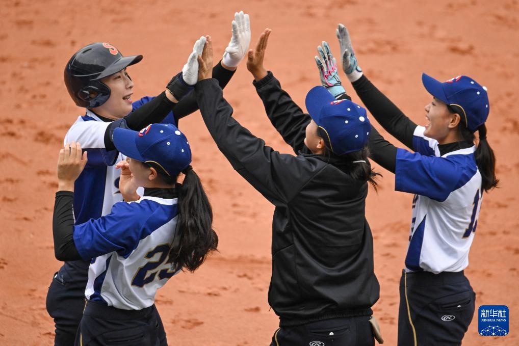 11月18日,四川队球员庆祝队友任敏(左上)本垒打得分。
