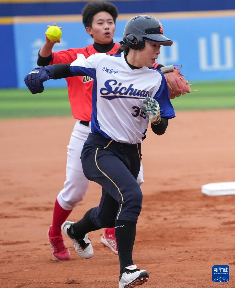 11月18日,四川队球员谢佳欣(前)在比赛中跑垒。