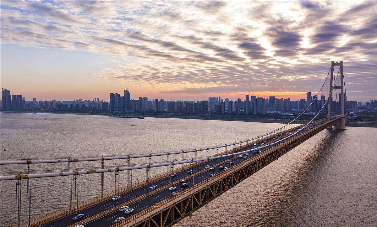 11月18日清晨,武汉上空出现绝美的朝霞,“鱼鳞云”在世界上跨度最长的公路悬索桥——杨泗港长江大桥上空飘浮,使天空格外美丽、壮观。因前日的一场雨,一场北风,吹走了雾霾,让江城的天空,呈现出如秋日般的高爽。(湖北日报全媒记者 朱熙勇 摄)