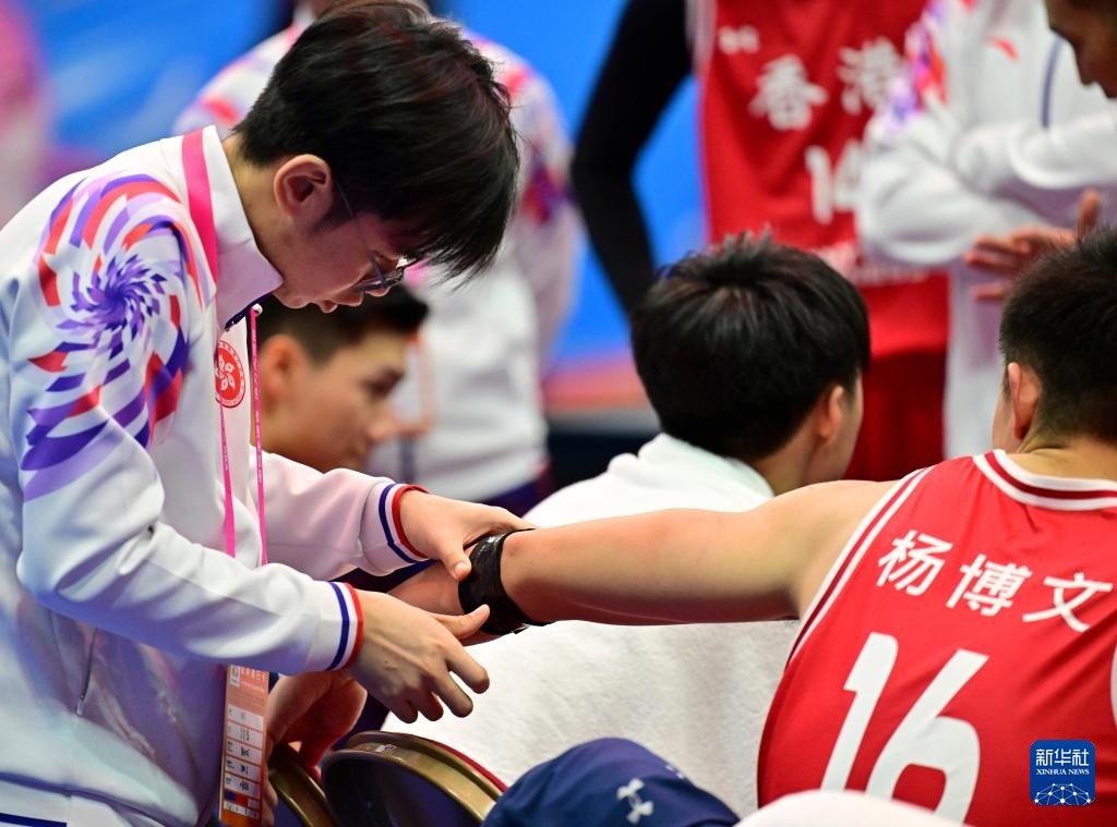 11月18日,香港队队医在比赛间隙处理球员杨博文的伤处。