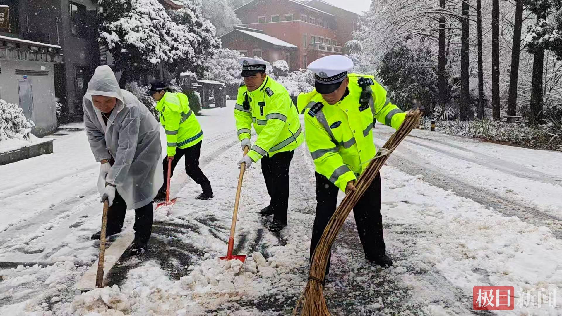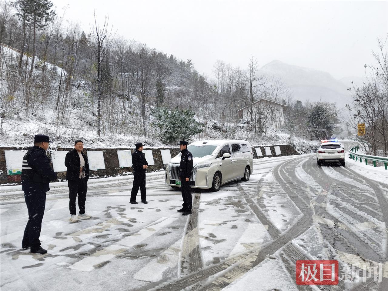 在房县野人谷景区,民警贾馥宇冒着刺骨寒风,在东蒿垭子路段来回巡查,用沙哑的嗓音不断提醒车辆减速慢行;在丹江口市大沟林区,民警与交通部门工作人员并肩作战,帮助被困车辆脱困;武当山景区,民警谭运璐细心搀扶香客,温暖的举动赢得外地游客连连称赞。