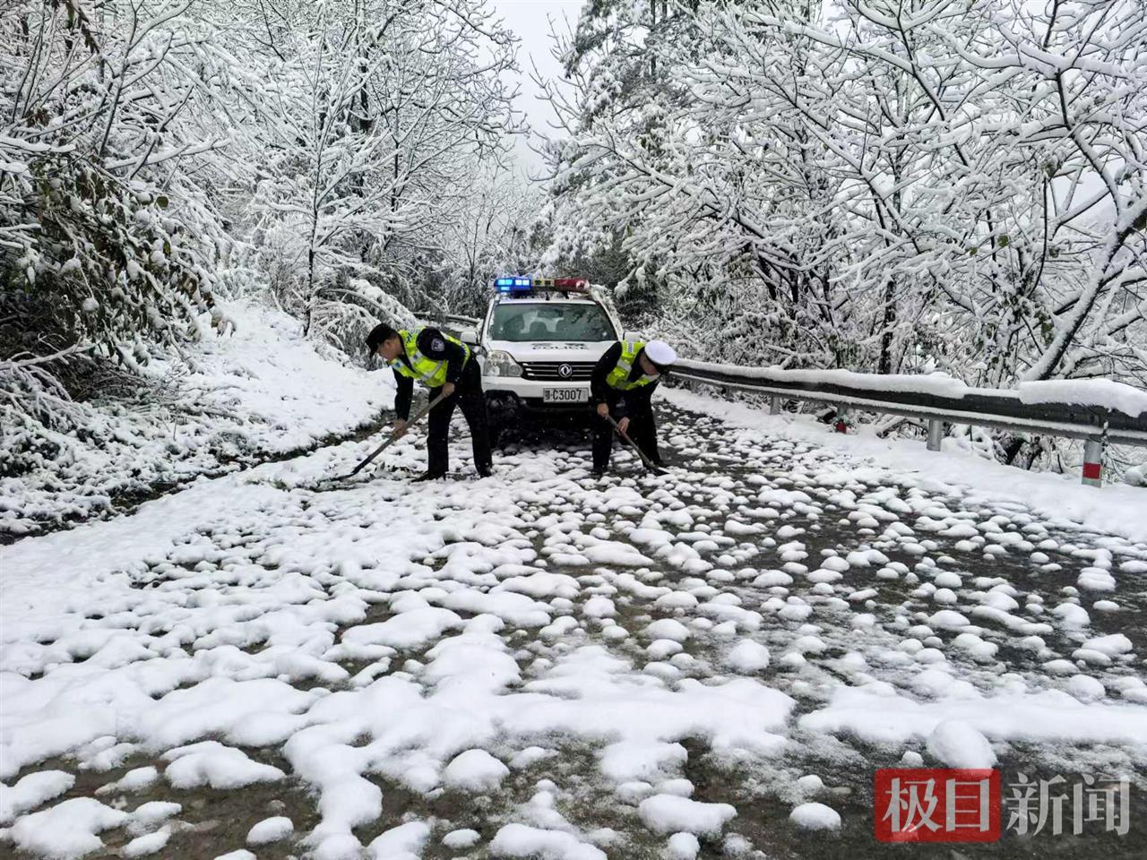 16日晚9时,郧西县湖北口乡率先飘雪。至次日清晨,坎子山村积雪厚度已达12厘米。“不带防滑链上不去,一定要注意安全!”湖北口派出所民警许浩在风雪中坚守路口,一遍遍提醒过往车辆。在积雪最厚的路段,民警果断实施交通管制,牢牢守住安全第一道防线。