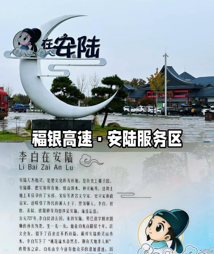 据了解,安陆服务区以“李白在安陆为主题”,被许多游客誉为“湖北最美服务区”。走进安陆服务区,一排唐风建筑映入眼帘。进入室内,宽敞明亮的大厅,琳琅满目的商品,让人感觉如同置身商场。除了美食区、商业区、超市,还有室内儿童乐园。穿过商业服务区,推开玻璃门,场景立即切换到一个生态景观文化公园。园内一步一景,十里长廊,围出一处池塘,池塘中央,以卷轴的形式,刻画出李白波澜壮阔的一生。碧波荡漾中,李白站立船头,举杯邀月。荷叶坊,以古诗《折荷有赠》中的荷叶为设计语言,荷叶旁水雾喷头曼妙起舞。酒店名为“客舍”,长廊里也布设了李白诗句和书法,一路行来,随处都是驻足观赏的游客,感受着唐风诗画之旅;诗文互动墙上,不少市民正翻动、拼写李白的诗文。