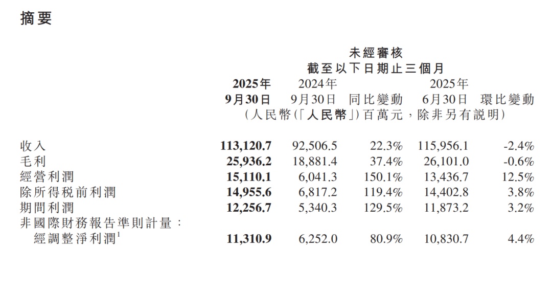 小米集团毛利由2024年第三季度的人民币189亿元增加37.4%至2025年第三季度的 人民币259亿元。毛利率由2024年第三季度的20.4%上升至2025年第三季度的22.9%。