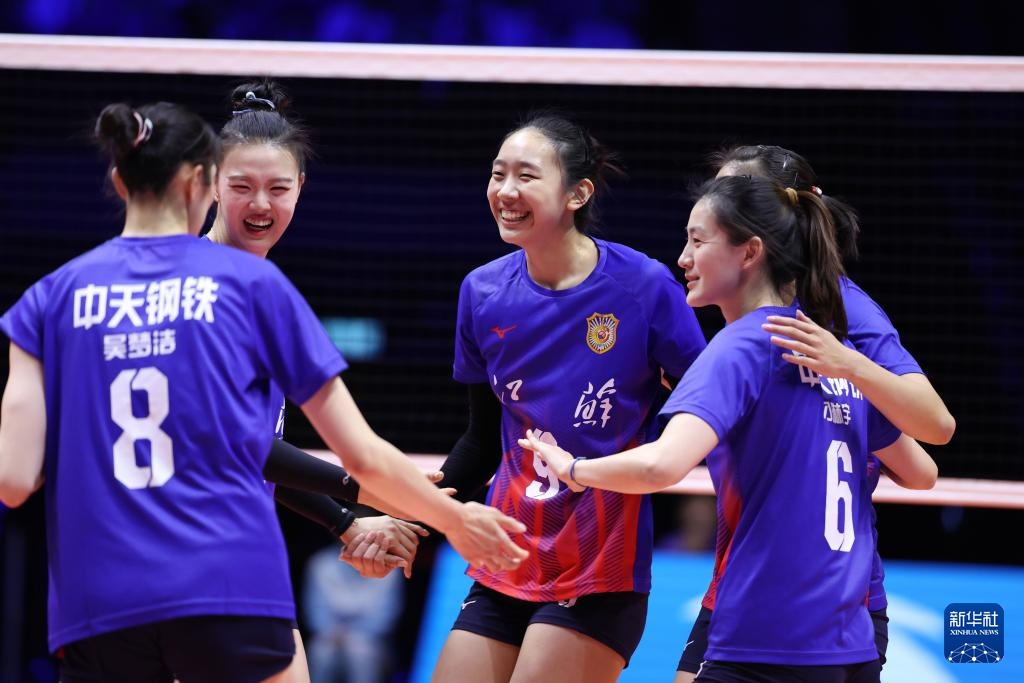 11月18日,江苏队球员万梓玥(中)和队友在比赛中庆祝得分。