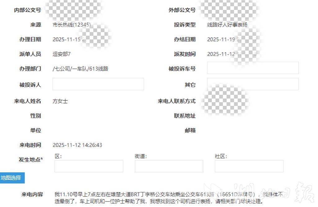 这份跨越一周的感谢,背后有个暖心故事。原来在11月10日早上7点多,613路公交车停靠石建村站时,方女士上车,驾驶员张浩就注意到她脸色不太好。见她坐在前排靠窗位置,张浩便多留了个心。