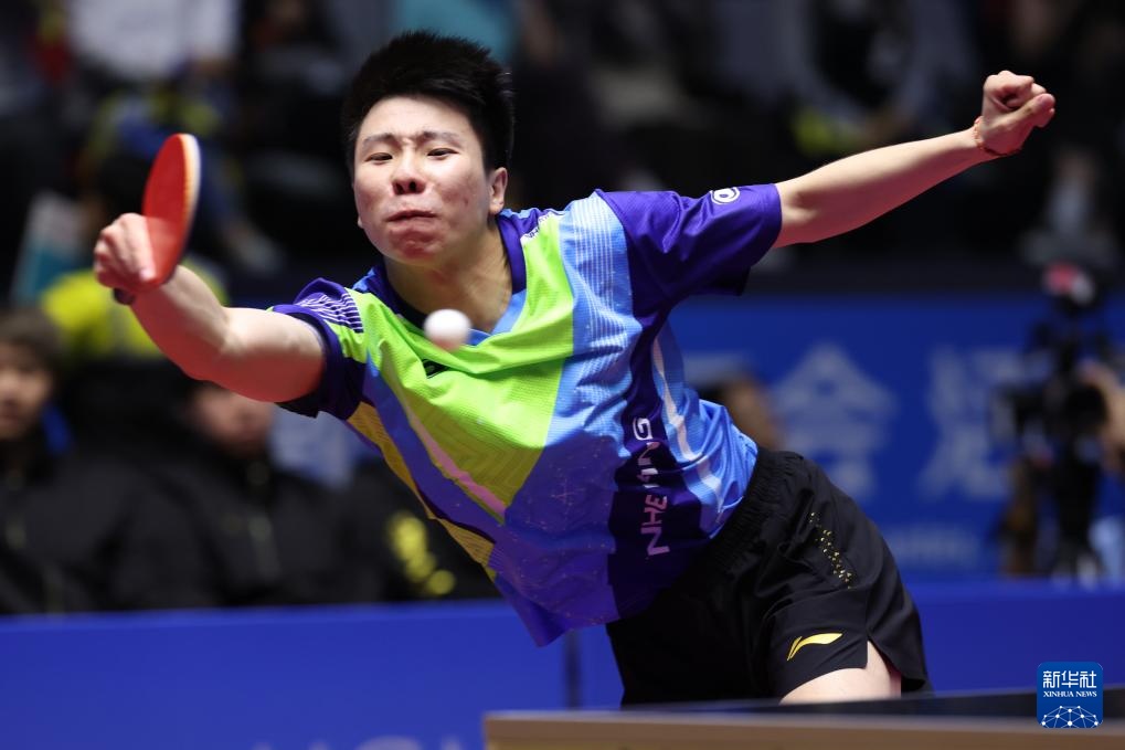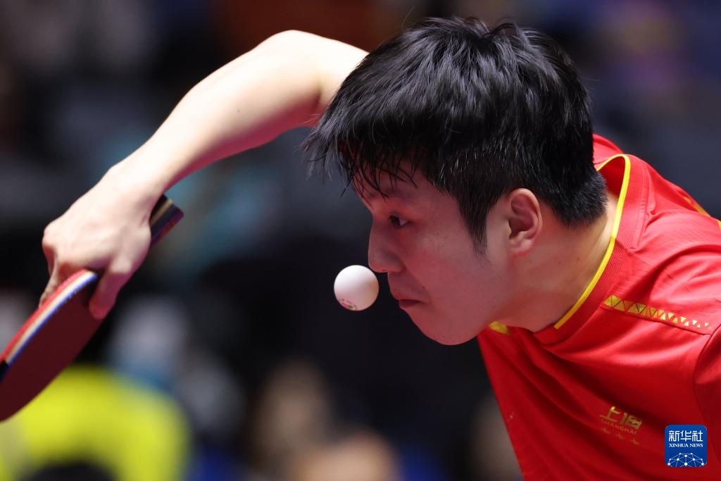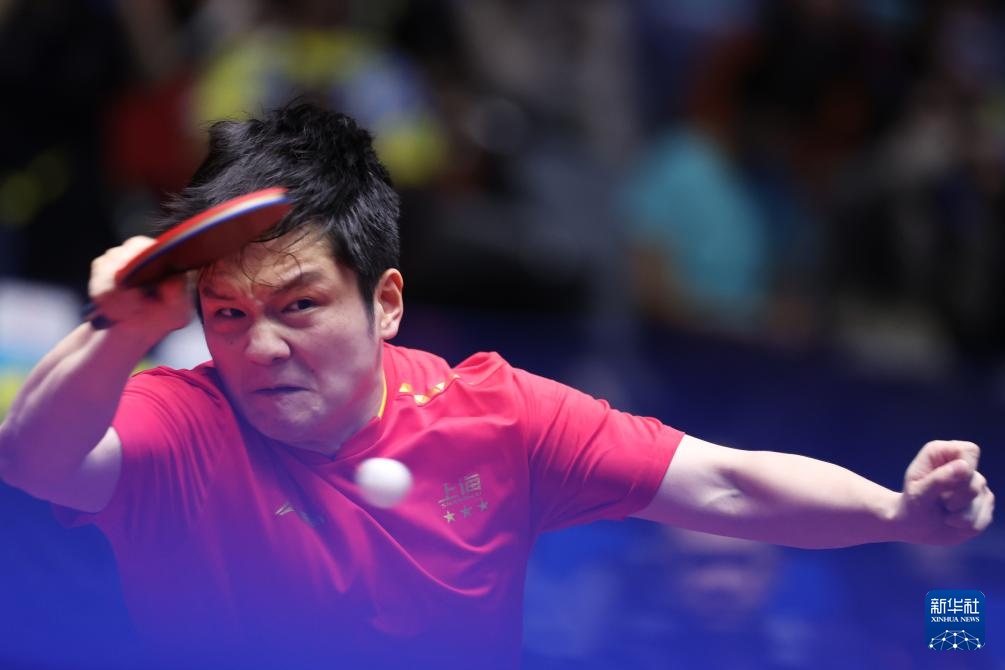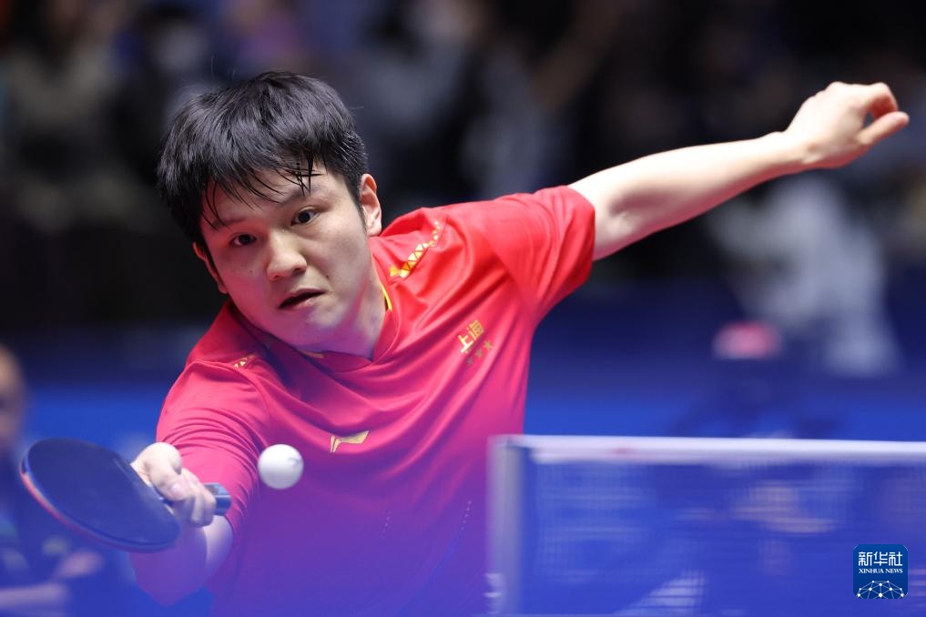 11月18日,上海队选手樊振东在比赛中回球。他对阵黑龙江队选手徐瑛彬。
