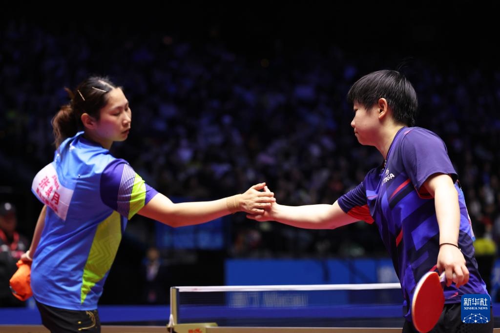11月18日,河北队选手孙颖莎(右)在女单比赛后和黑龙江队选手张缤月相互致意。孙颖莎3比0获胜。