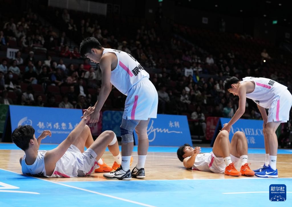 11月18日,浙江队球员欧懿远(左一)、沈唐铭(左三)在比赛中摔倒。