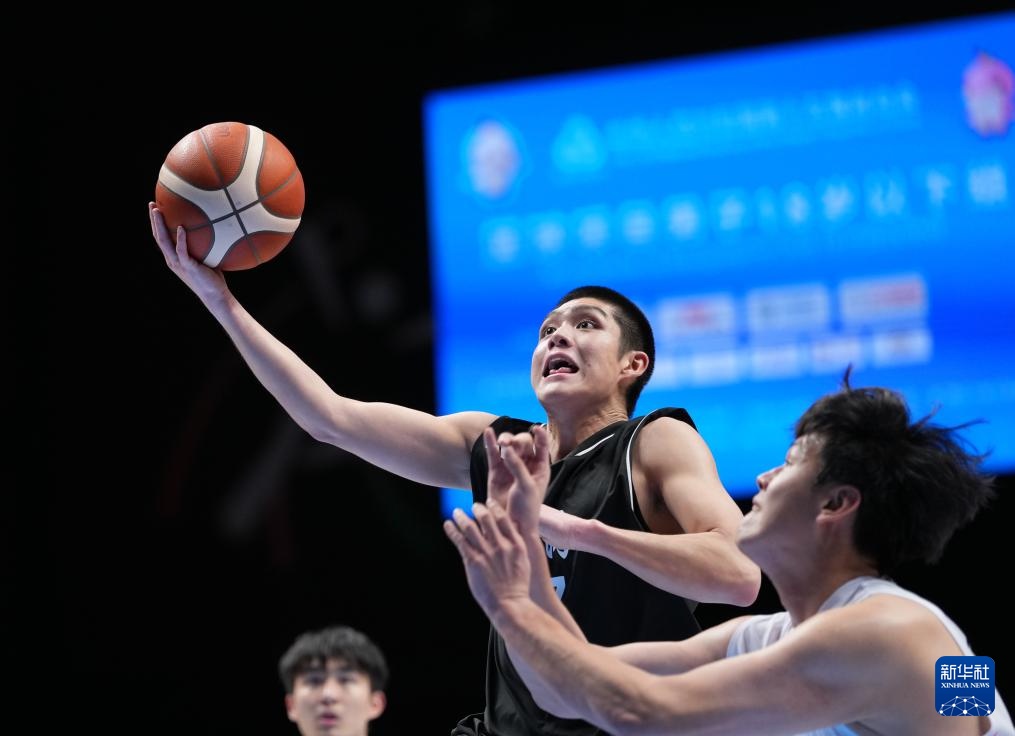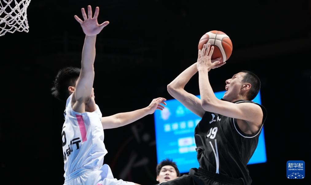11月18日,上海队球员王子恒(右)突破浙江队球员石洺豪的防守。